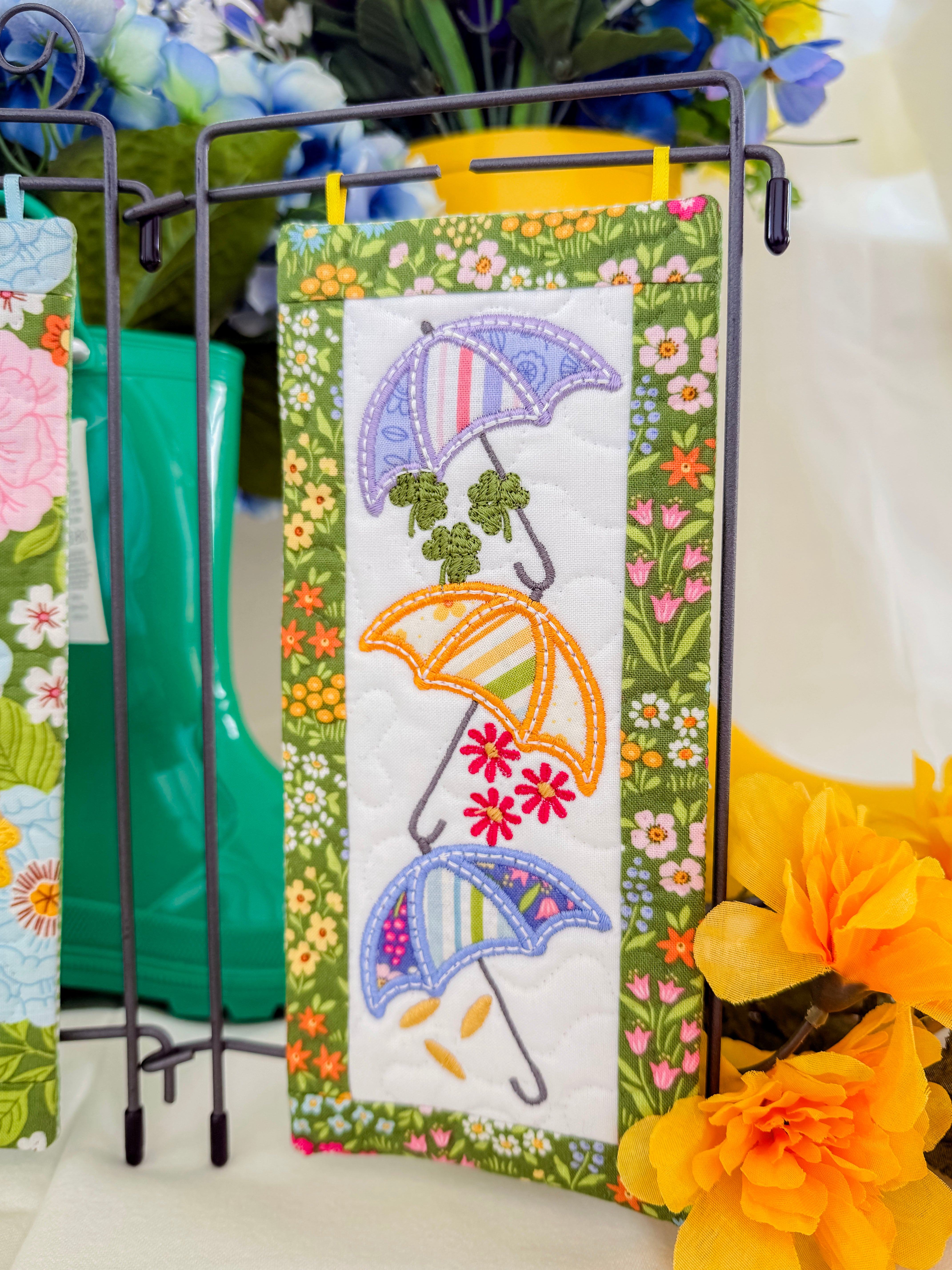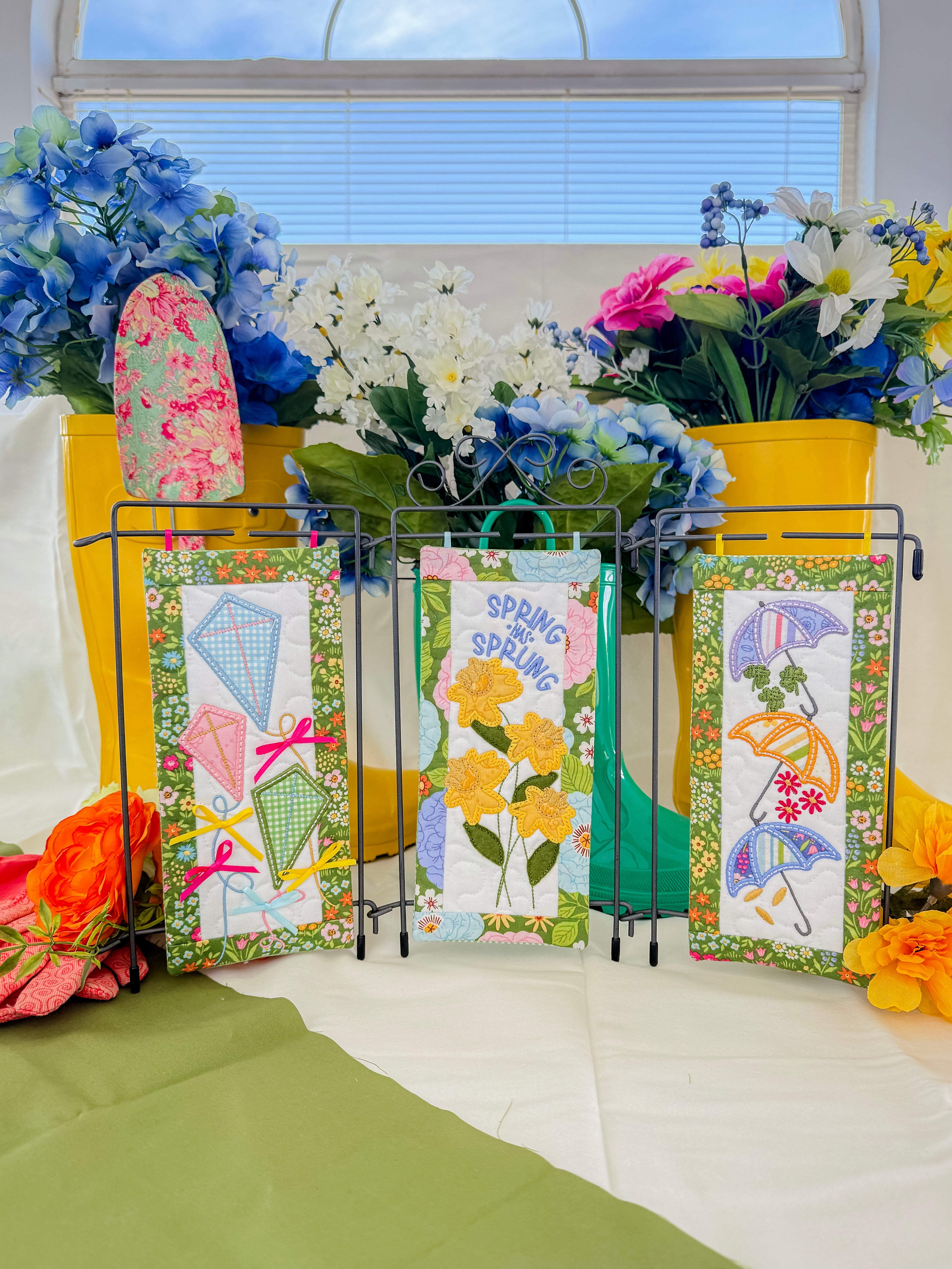 Celebrate the seasons with the Mini Quilt Trio: Shamrock, Sunshine and Showers, a cheerful sewing and machine embroidery pattern set from My Girlfriend’s Quilt Shoppe. This delightful trio features three mini quilts inspired by springtime themes—perfect for rotating seasonal décor or displaying together for a bright, welcoming look.