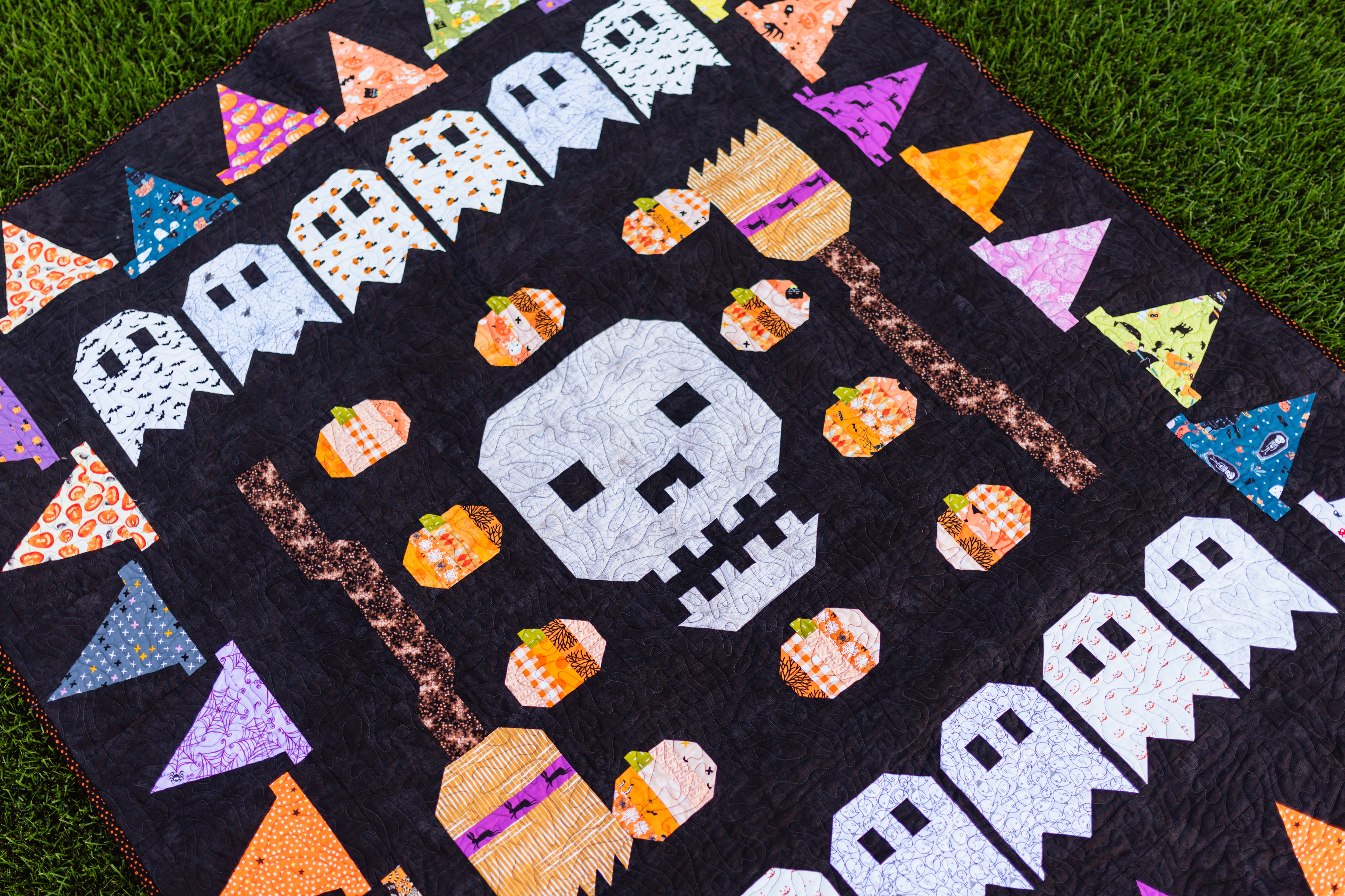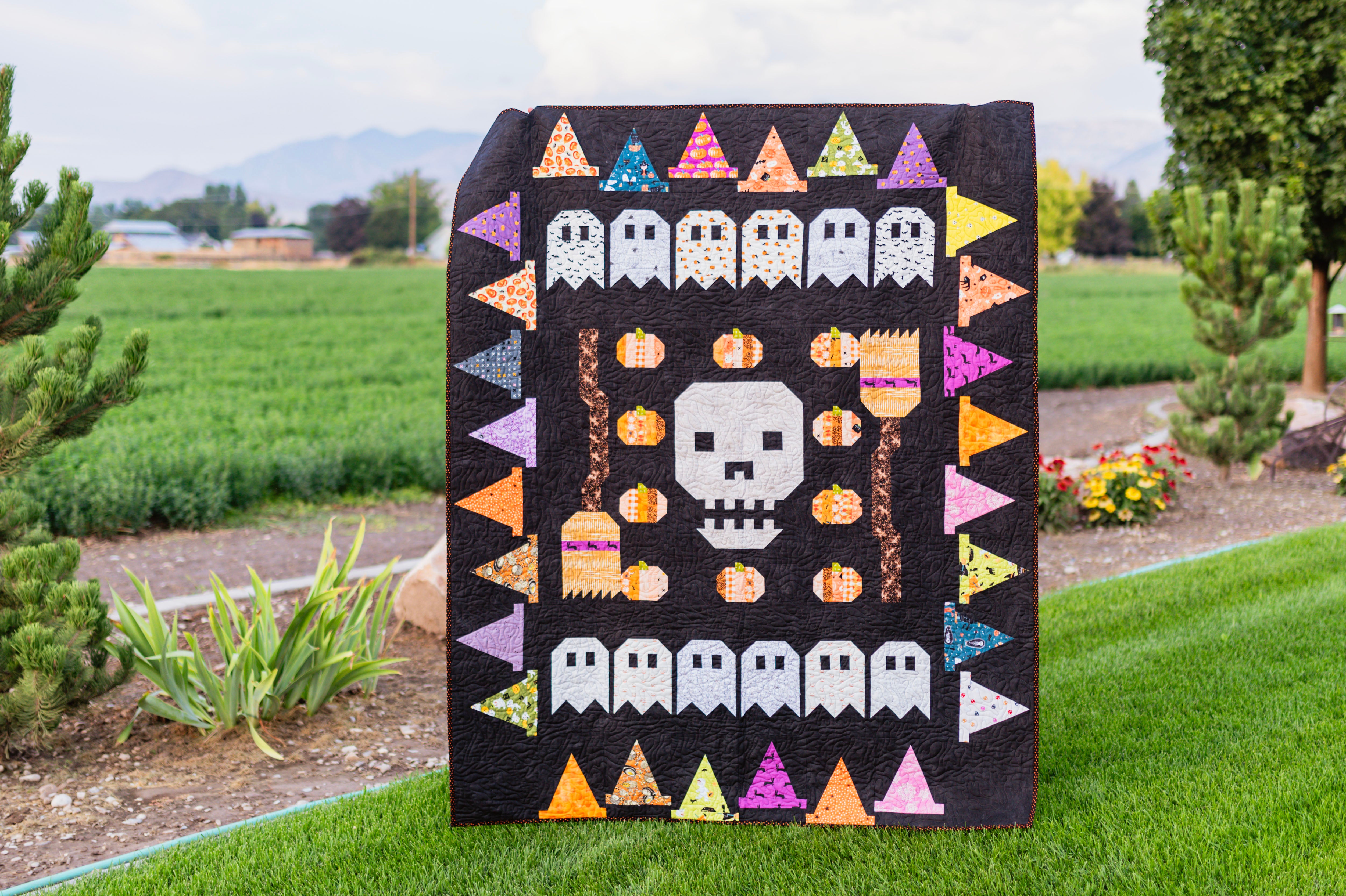 Join the spooky fun with Ghoul Gang, the 2025 Club Mystery Quilt from My Girlfriend’s Quilt Shoppe! Now available as a downloadable pattern, this hauntingly fun quilt design features a bold skull at the center, surrounded by cheerful pumpkins, mischievous ghosts, witch hats, and playful broomsticks—all stitched together in a whimsical Halloween palette.