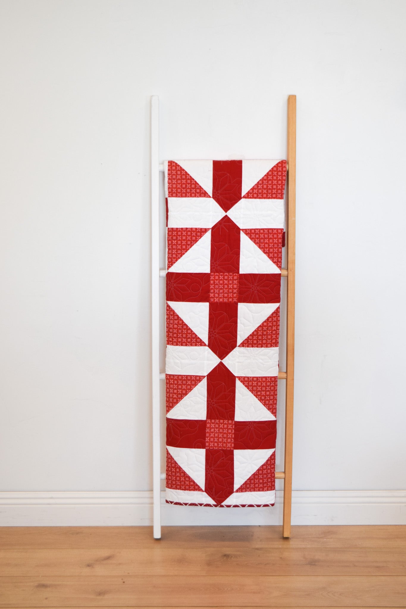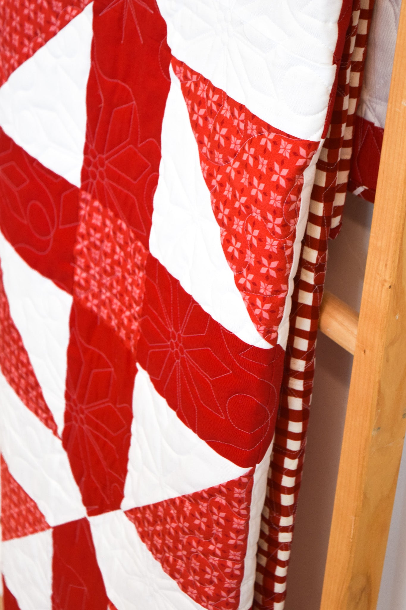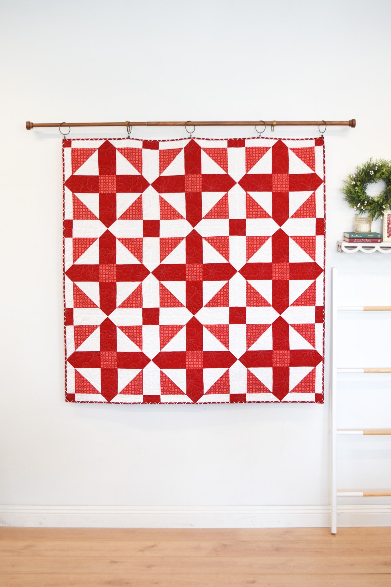 Description: Bring timeless style to every season with this striking geometric red and white quilt from My Girlfriend's Quilt Shoppe. Designed with crisp lines and bold contrast, this modern take on a classic color combo adds instant cheer--perfect for Christmas, Valentines Day, or any cozy day in between. Whether draped over a couch or layered on your favorite bed, it is the ultimate blend of festive and fresh.