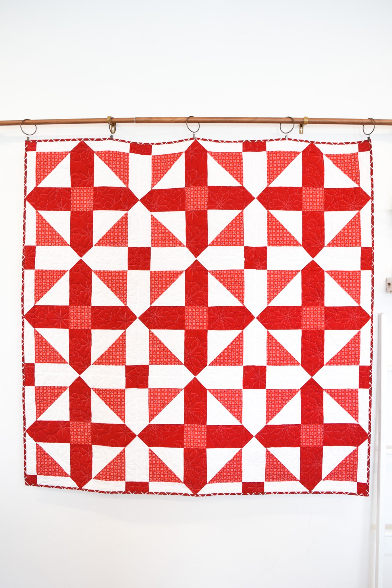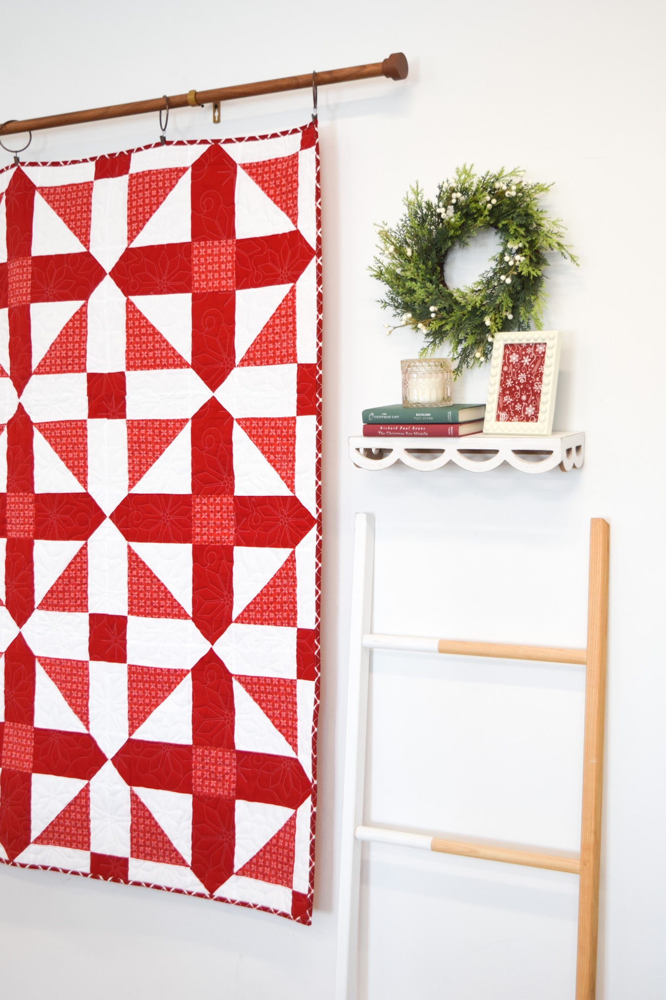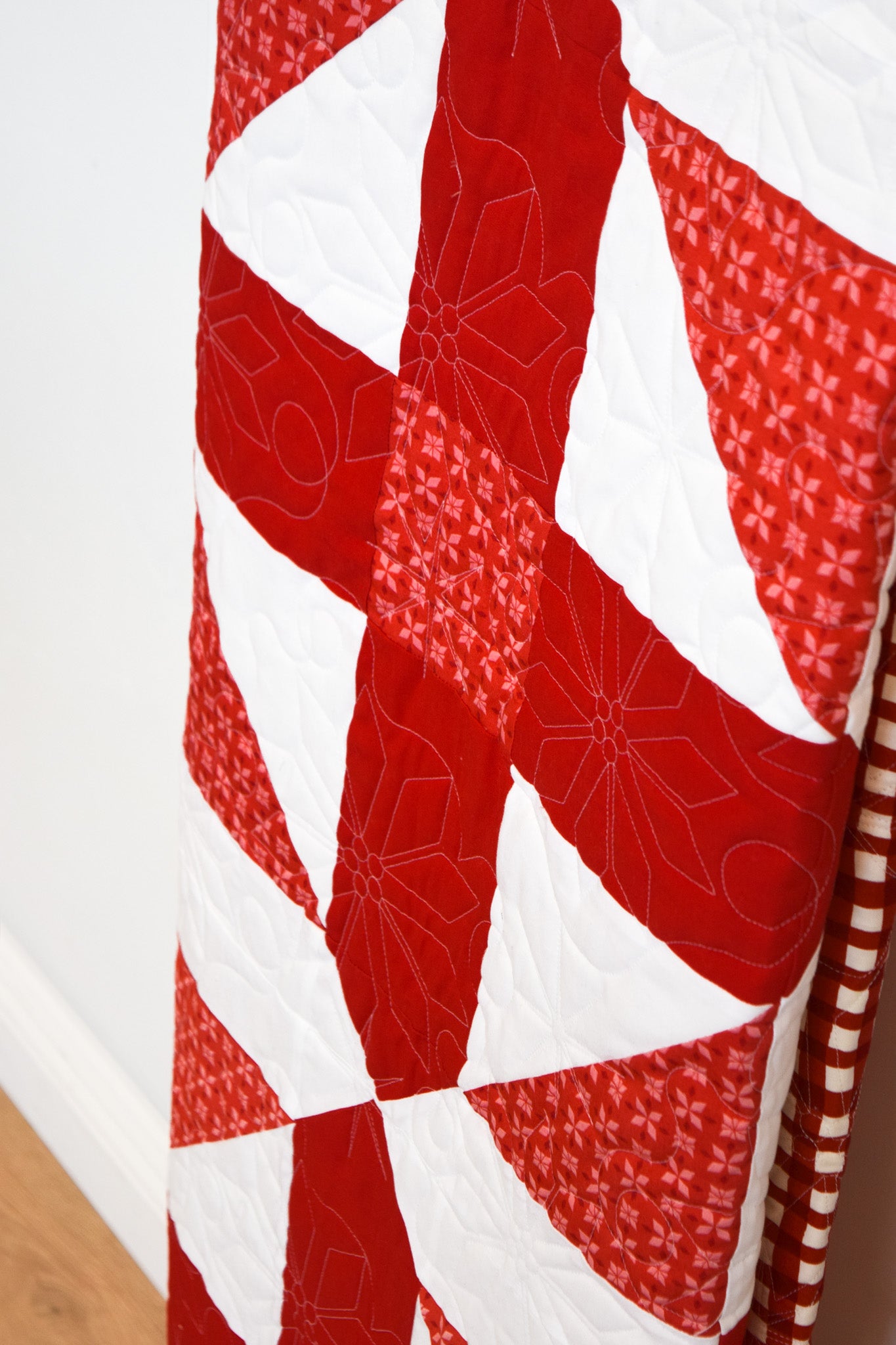 Description: Bring timeless style to every season with this striking geometric red and white quilt from My Girlfriend's Quilt Shoppe. Designed with crisp lines and bold contrast, this modern take on a classic color combo adds instant cheer--perfect for Christmas, Valentines Day, or any cozy day in between. Whether draped over a couch or layered on your favorite bed, it is the ultimate blend of festive and fresh.