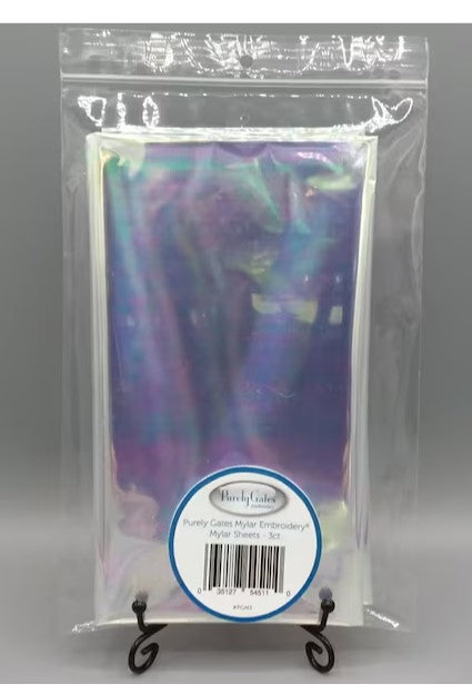 Purely Gates Mylar gives our designs that wonderful sparkle and shine. We only use the Opalescent color of the iridescent tissue. Purely Gates Mylar tears away easily, does not shred thread, and does not dull your needle. It will pick up the color of thread that is stitched over it.