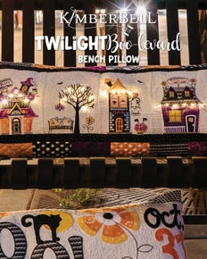 Stroll along the Twilight Boo-levard to visit all of your favorite “haunts!” Stop into Bella’s Boo-tique for their grand opening, then rest a spell beneath a spooky old tree. The boo-berry pie from Broomhilda’s Bakery is simply “to die for.” Enjoy a slice, then sign up for the mystery quilt at the Candy Corn Quilt Shoppe! With fairy lights, Embroidery Leather, buttons and Mylar and more, Kimberbell’s Twilight Boo-levard Bench Pillow is so enchanting, it’s almost scary.