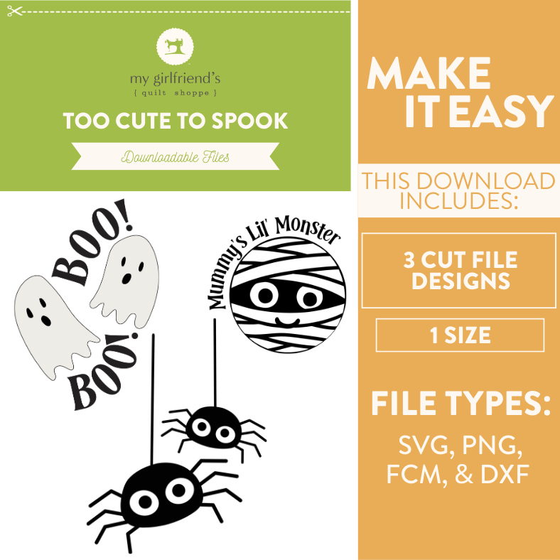 Get creative this Halloween with the Too Cute to Spook Cut Files for the Brother ScanNCut, designed exclusively by My Girlfriend’s Quilt Shoppe. This digital set includes fun Halloween shapes and appliqué motifs—perfect for fabric projects, vinyl designs, paper crafts, and more. Easy to use and full of charm, it’s a great way to add a handmade touch to your spooky season.