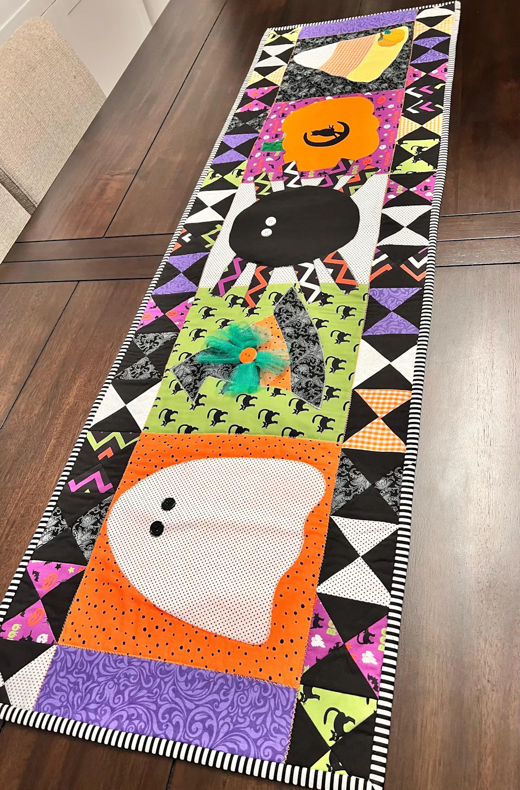 Halloween is just around the block! This cute table runner will adorn your space, perfect for the spooky season.