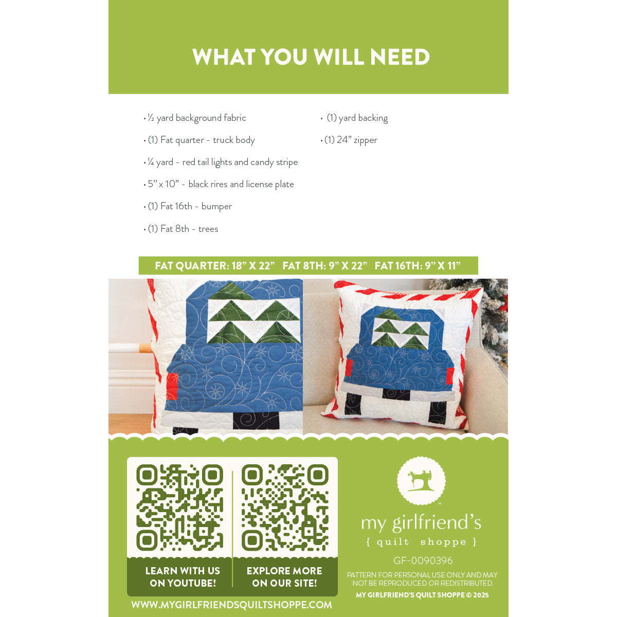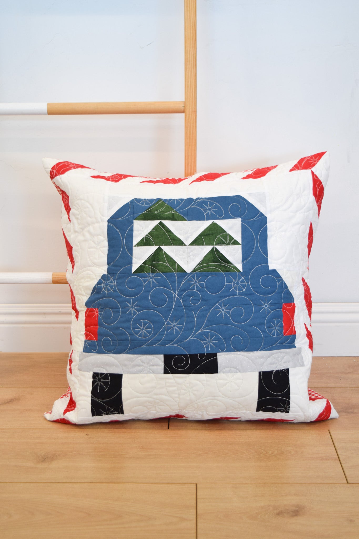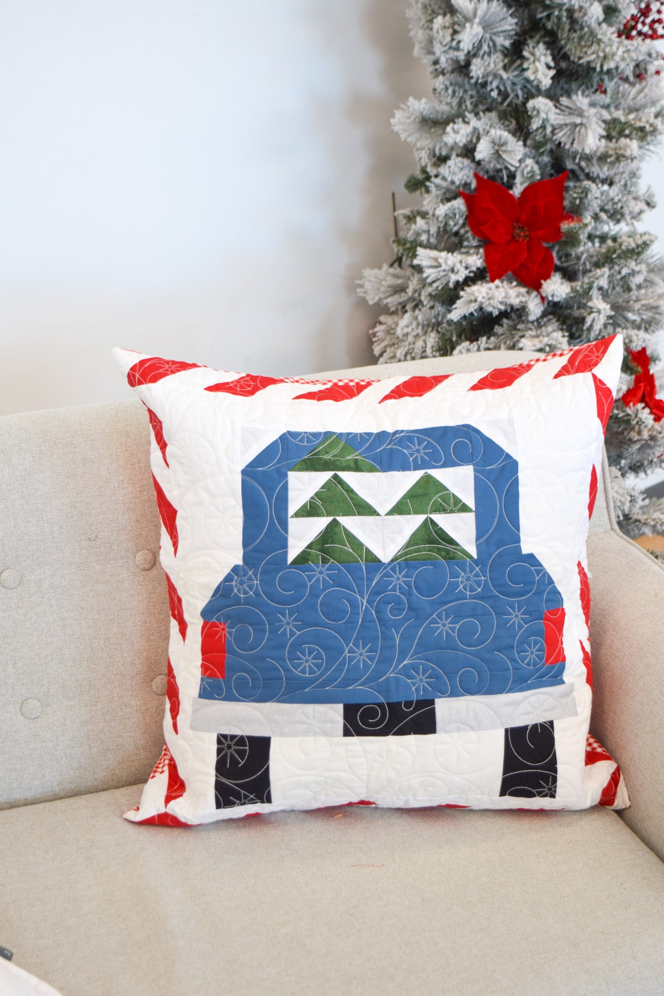 Description: Load up the holiday cheer--this exclusive pillow from My Girlfriend's Quilt Shoppe has it all! Picture a charming blue truck hauling pine trees framed up with festive red and white candy cane striped border. That is basically Christmas spirit stitched into fabric. Pairs perfectly with the North Pole Tree Farm Quilt.