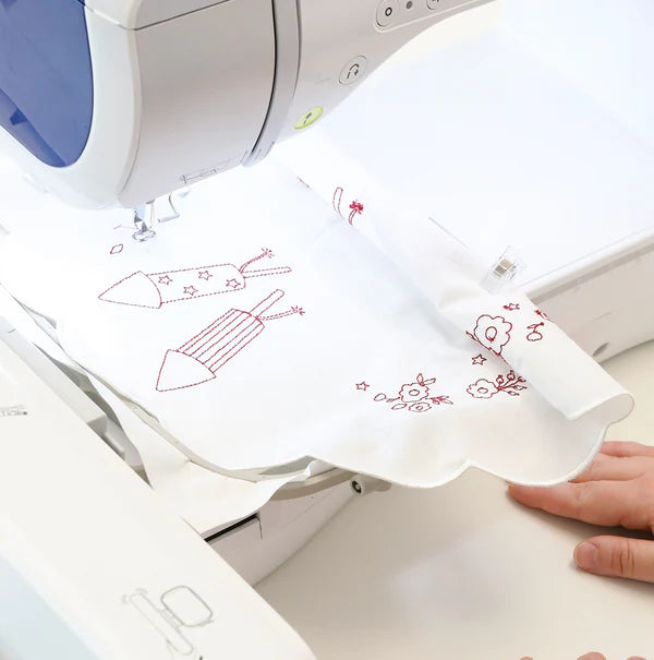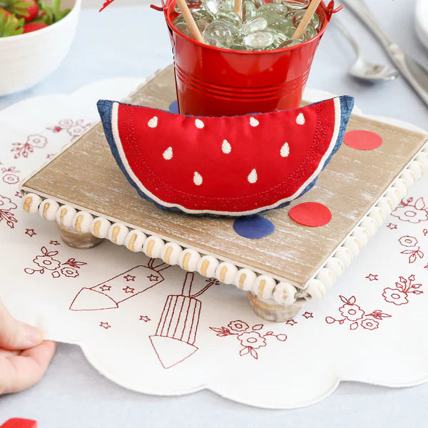 Join the Patriotic Parade! Create a festive table display with five charming designs! Stitch the Redwork Table Round and layer it beneath the included table riser and red pail. The Patriotic Posy and two Starry Blossoms come together to form a delightful floral centerpiece, while the Summer Slice Stuffie adds the perfect finishing touch. Featuring new blanks and irresistible accessories, Patriotic Parade is a heartfelt celebration of hometown pride. Perfect for Summer Celebrations!