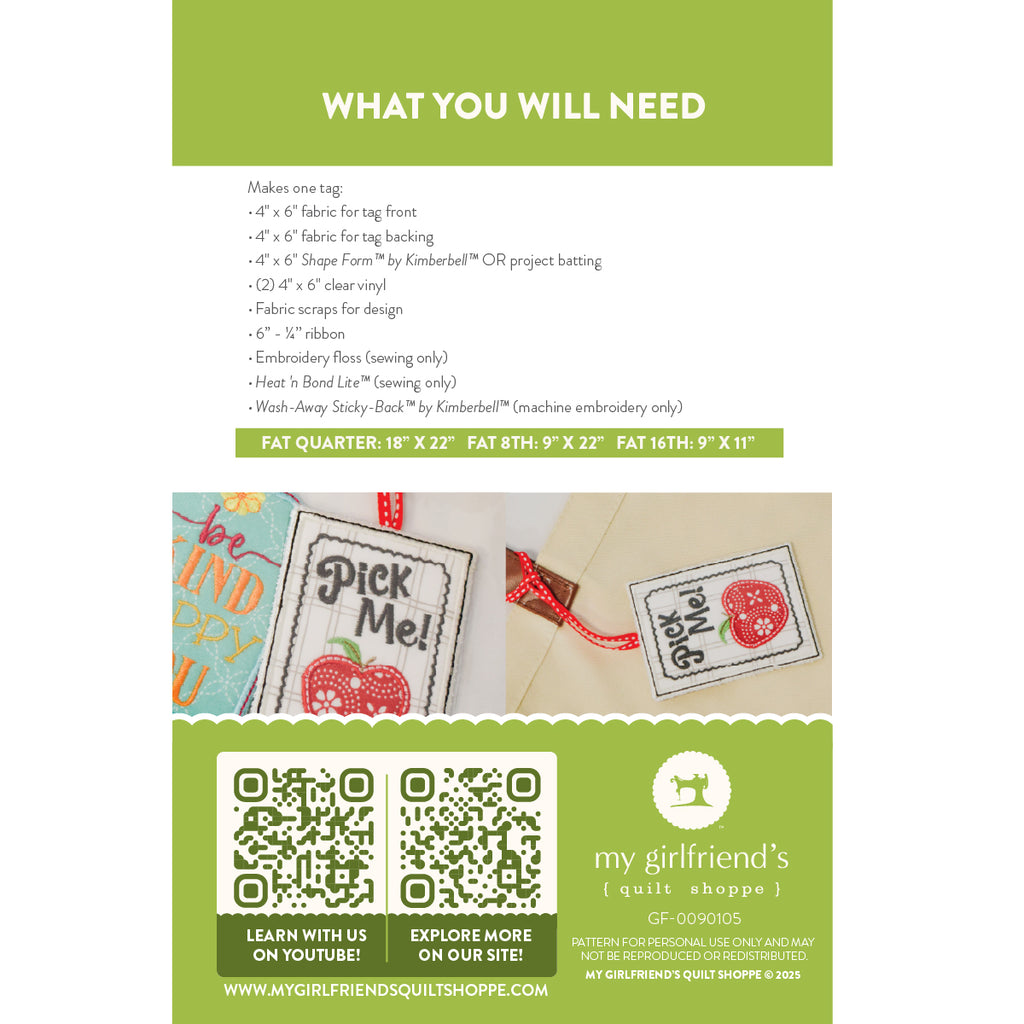 Pick Me Bag Tag (Downloadable Sewing and Machine Embroidery Pattern)