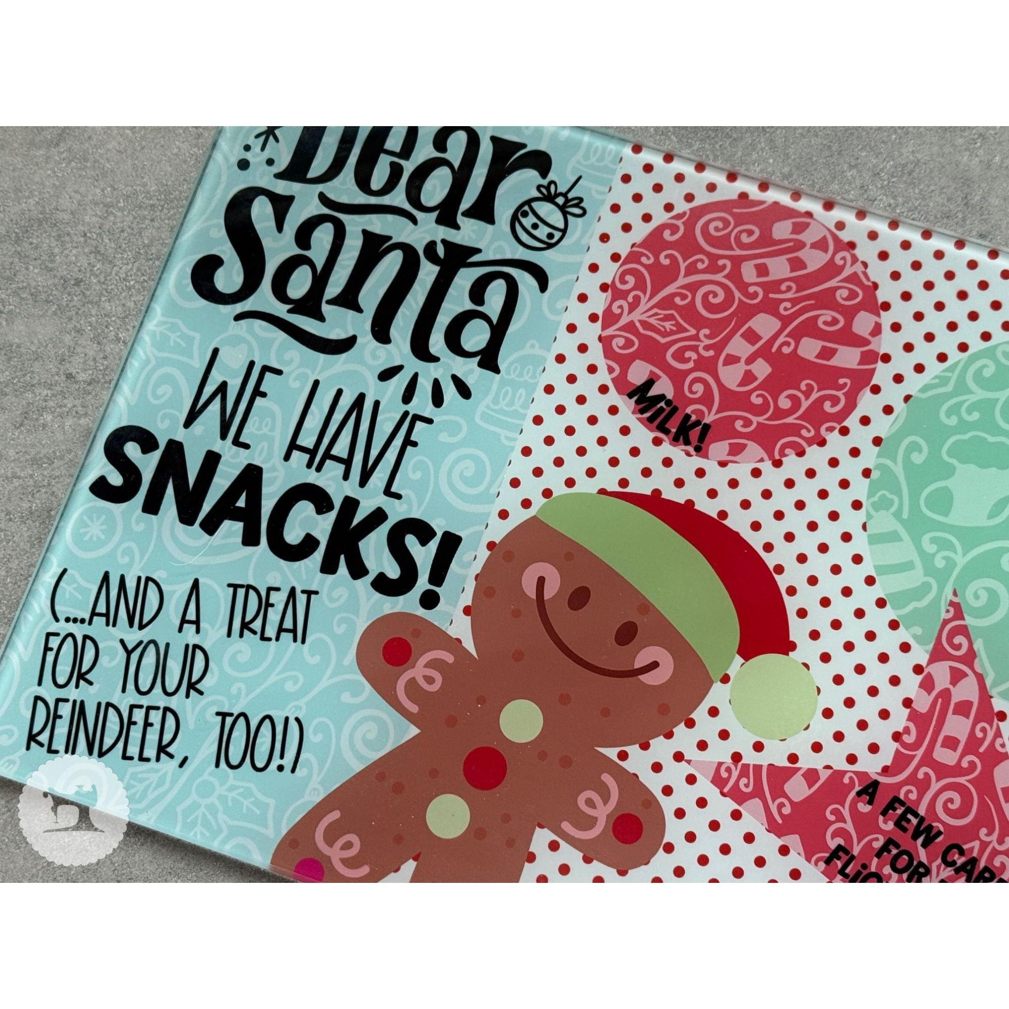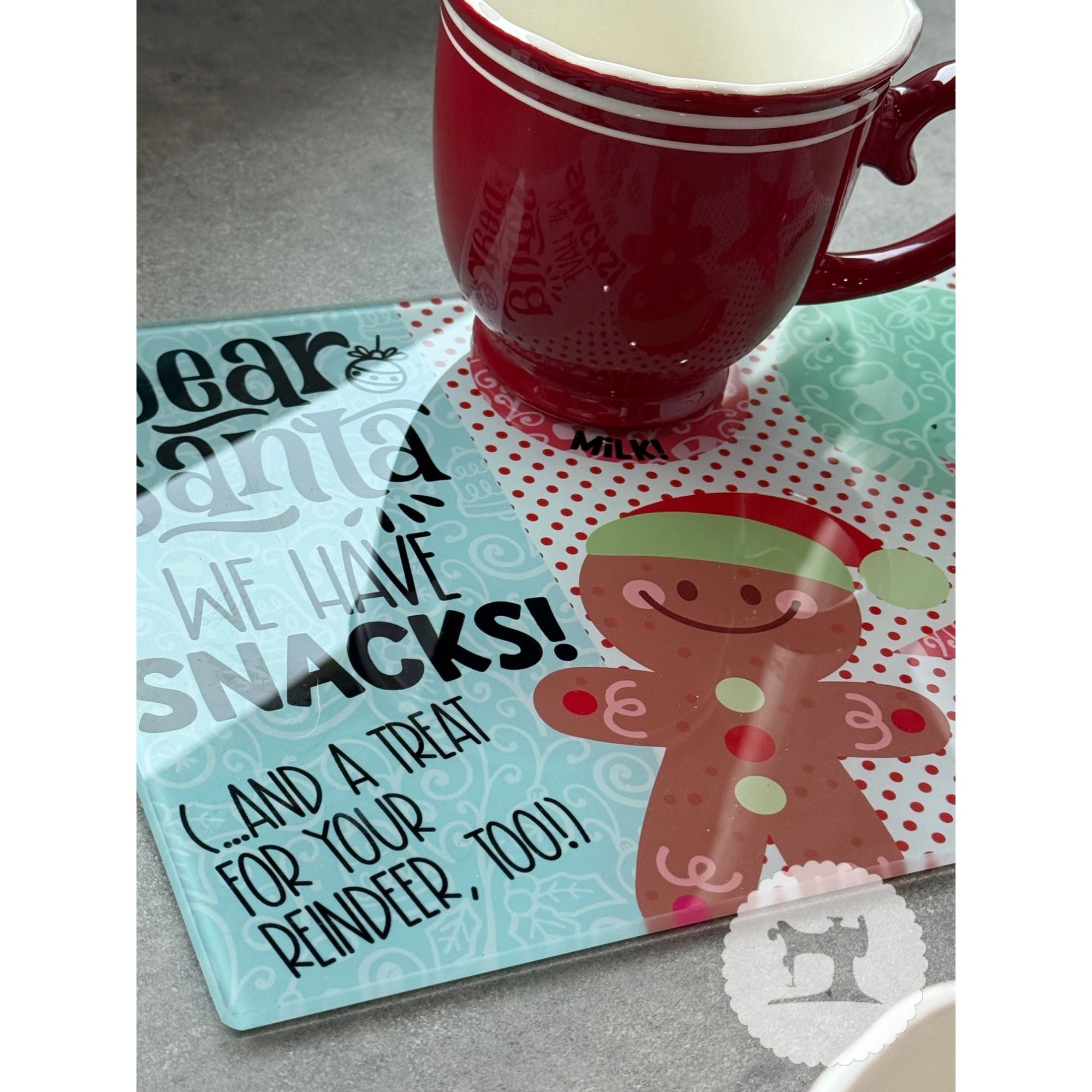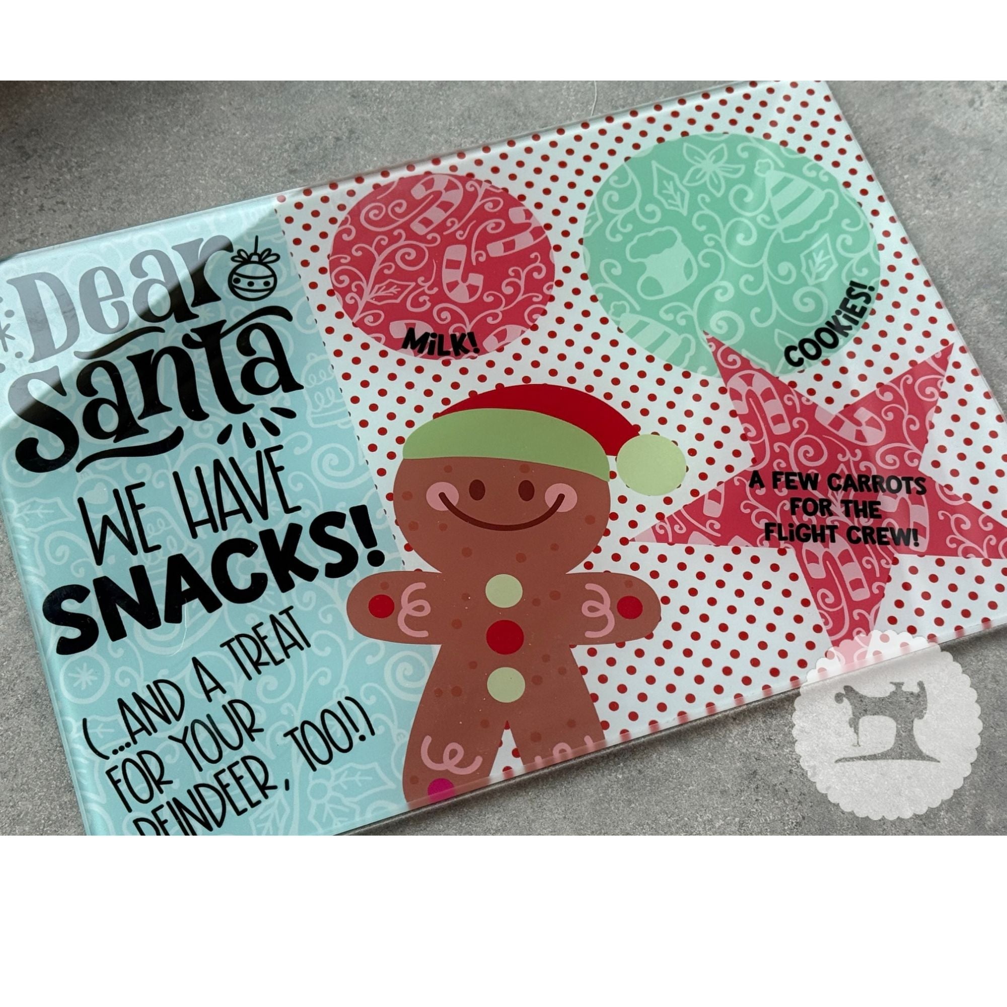 Make Christmas Eve extra magical with this playful “Dear Santa, We Have Snacks!” sublimation design—complete with a cheerful gingerbread friend and cute callouts for milk, cookies, and carrots for the reindeer crew. It’s perfect for creating a holiday glass cutting board that becomes a yearly tradition for families!