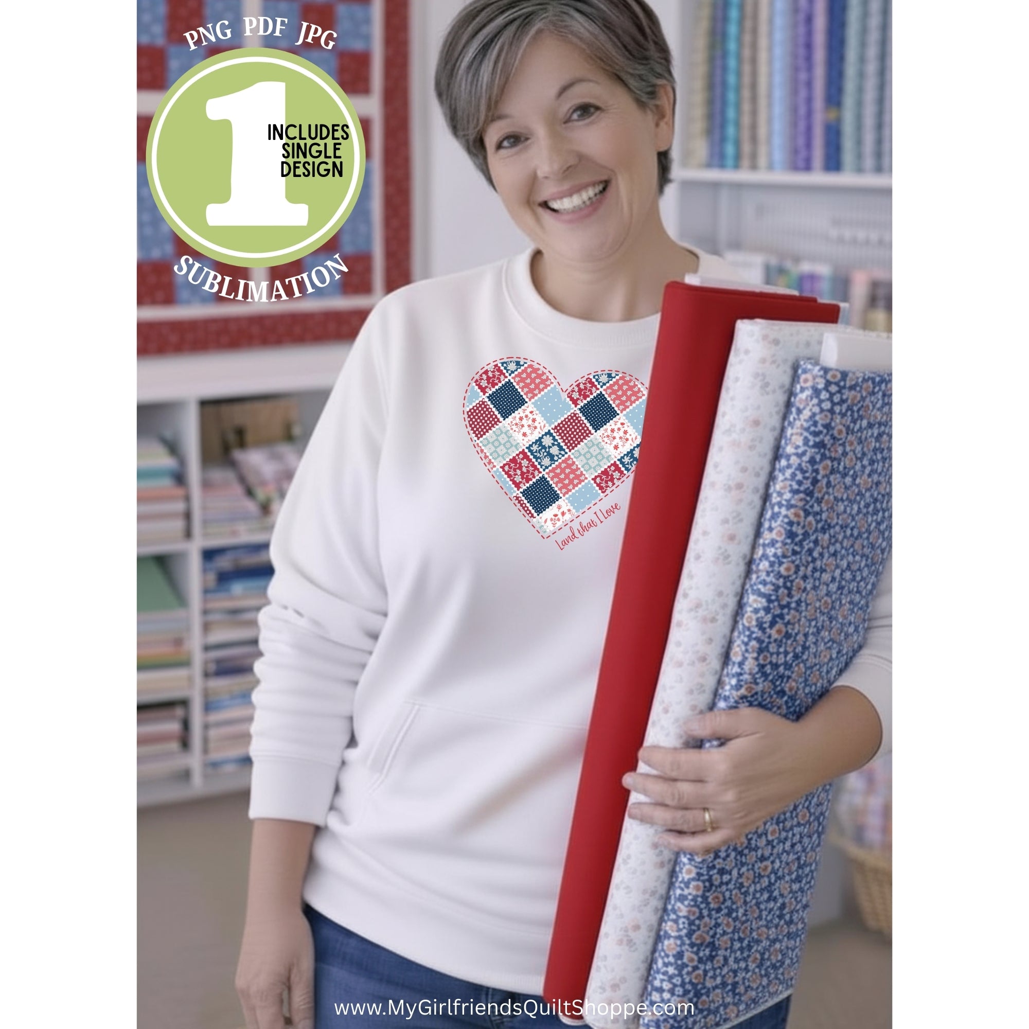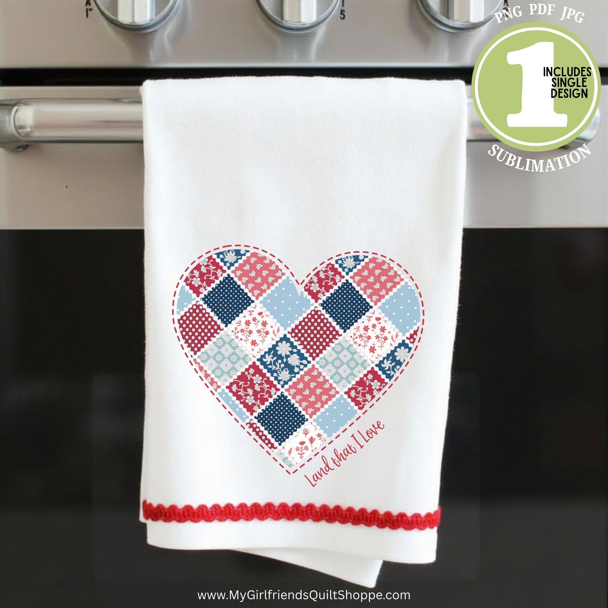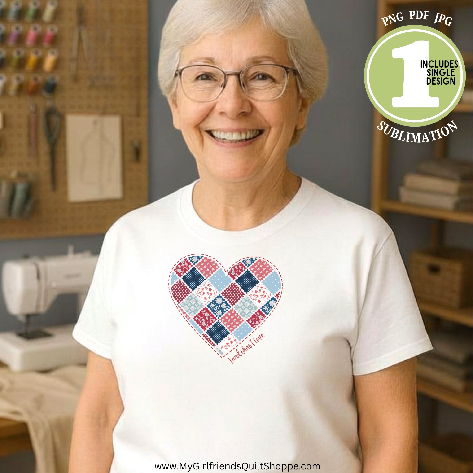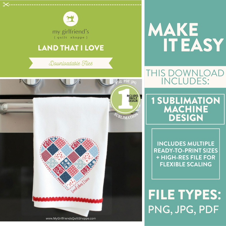 Celebrate your love for country and quilting with this beautiful “Land That I Love” patriotic sublimation design!Featuring a charming heart made from patchwork quilt blocks in classic red, white, and blue fabrics, this design is perfect for quilters, sewists, and patriotic makers who appreciate the timeless beauty of handmade traditions.