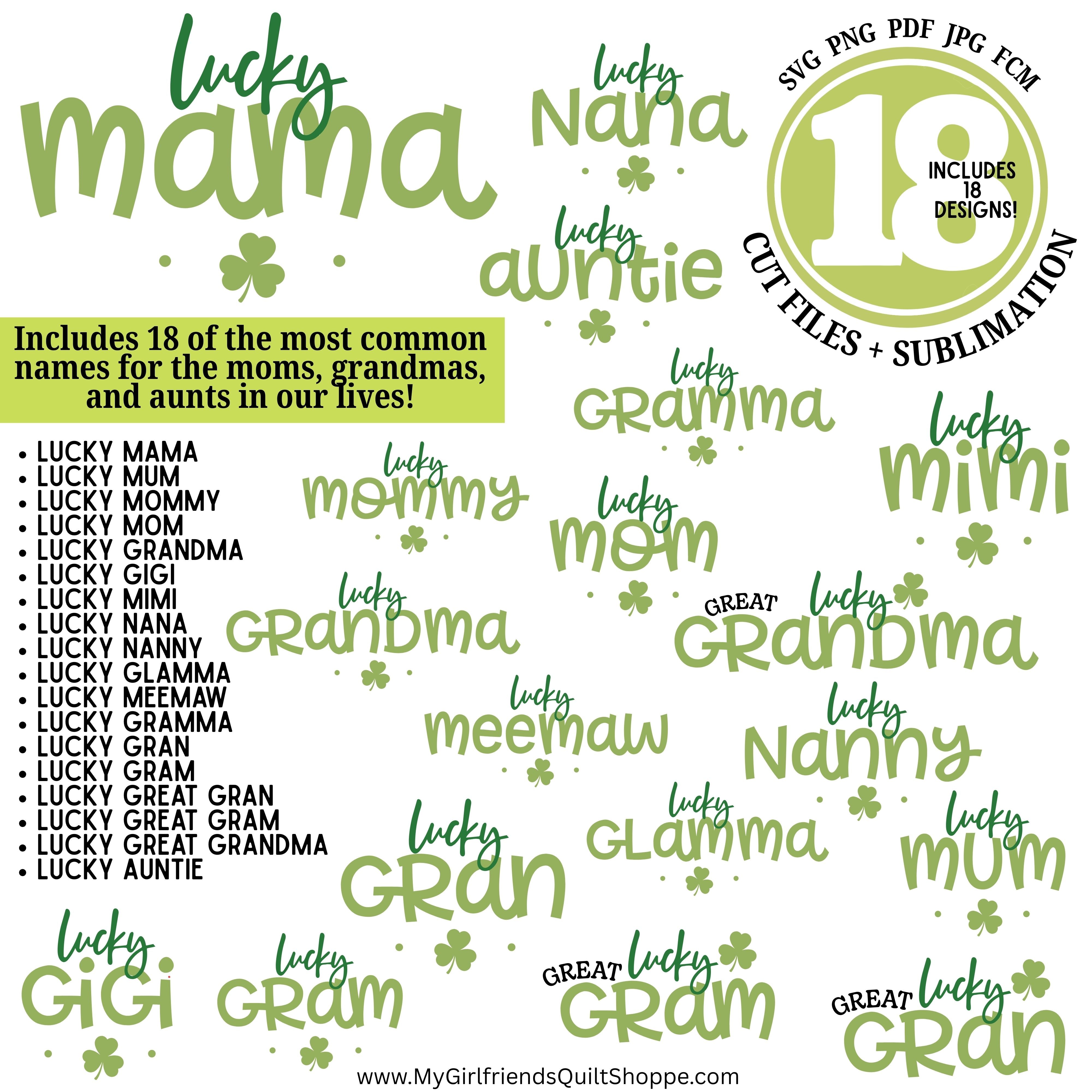 This Lucky Mama SVG Bundle includes 18 of the most popular mom, grandma, and aunt name variations in one convenient download. Perfect for Cricut, Silhouette, Brother ScanNCut, sublimation printing, and HTV projects.