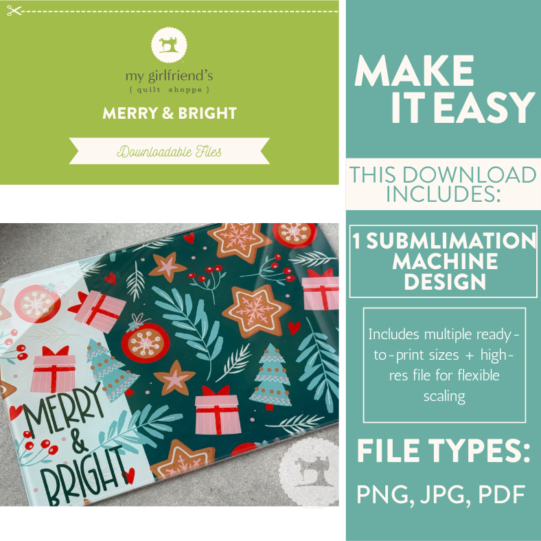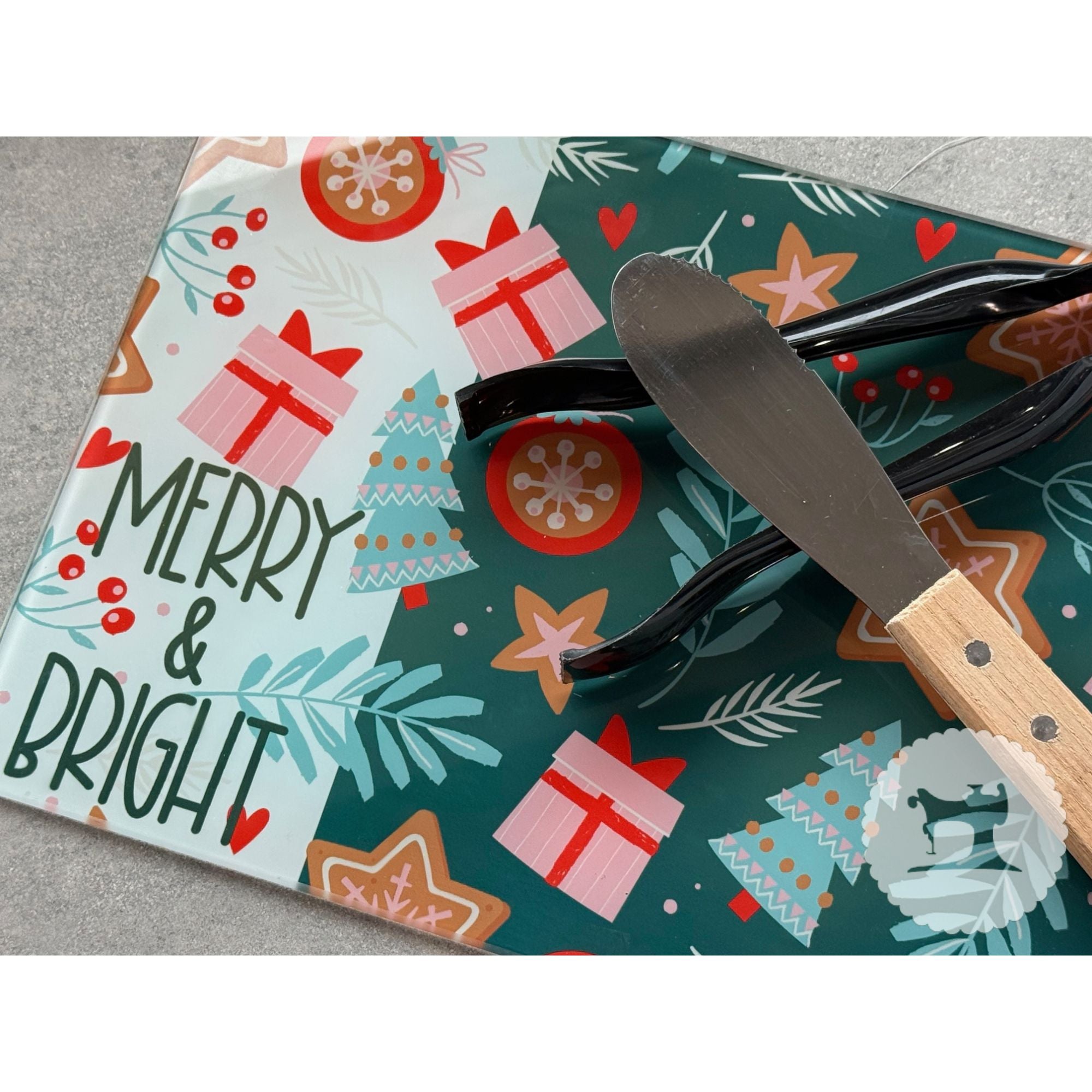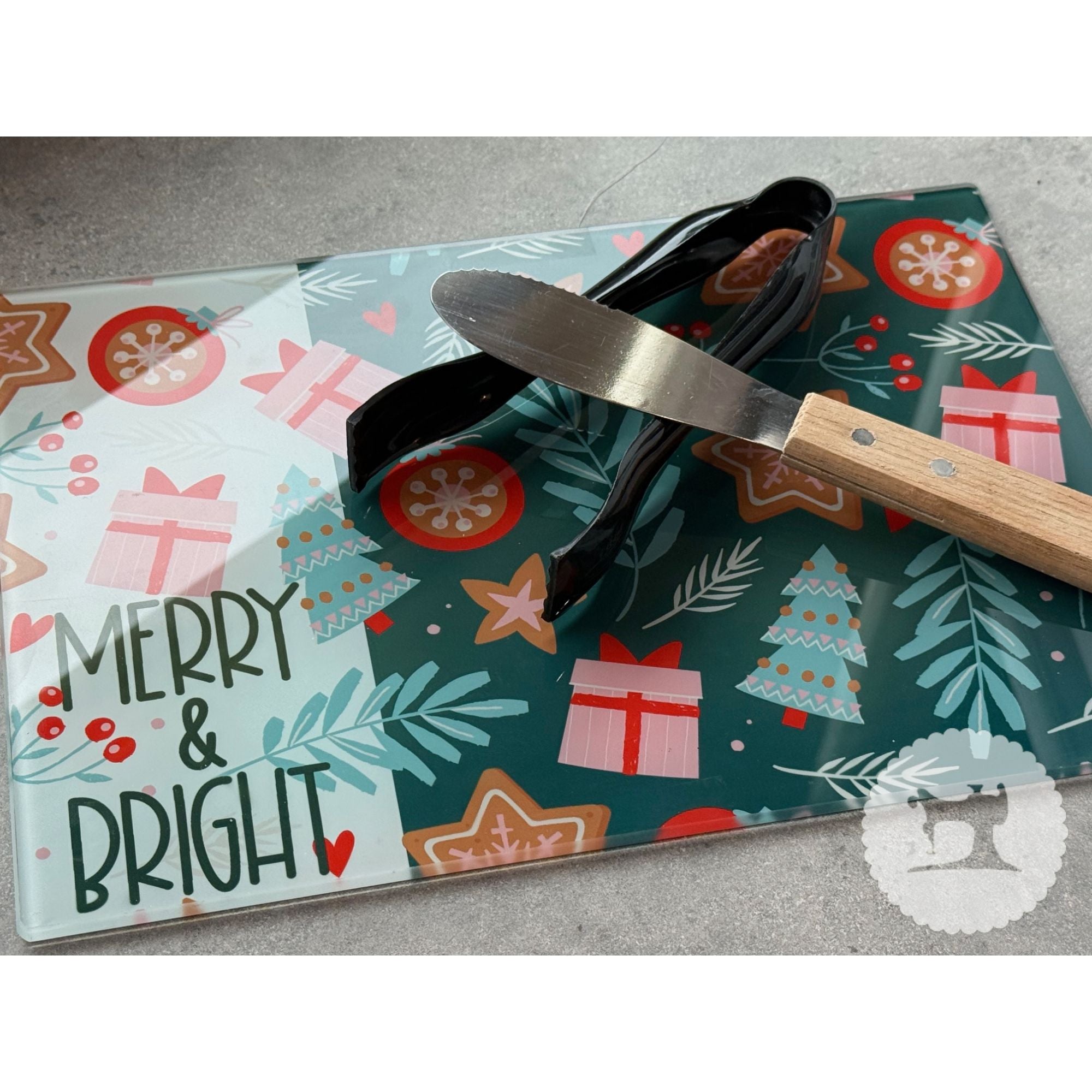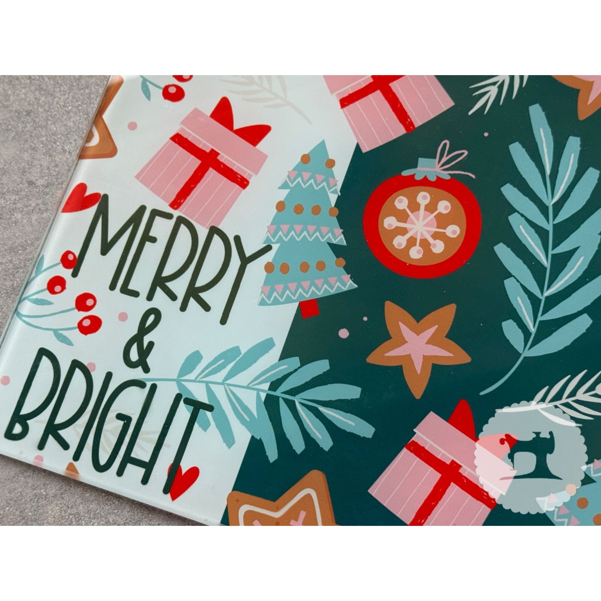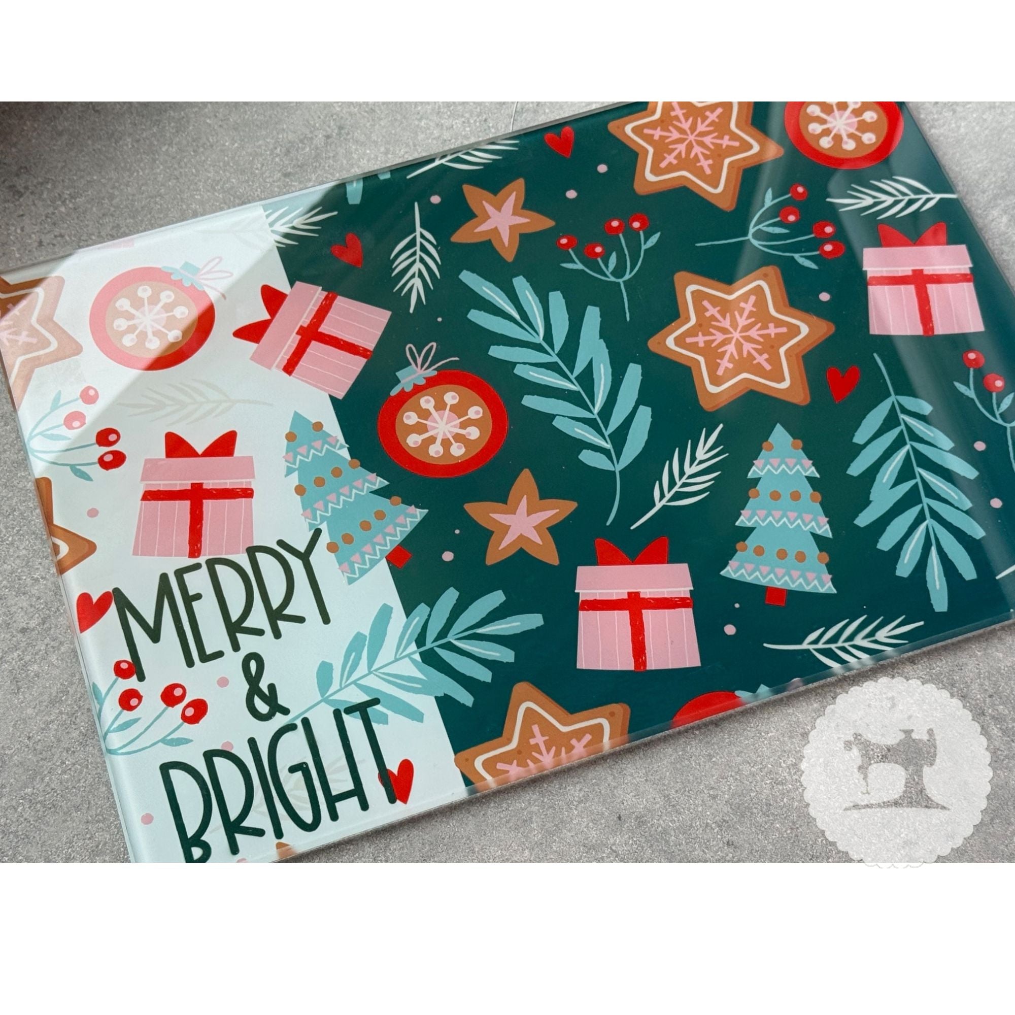 Bring festive cheer to your kitchen projects with this Merry & Bright sublimation design, created especially for glass cutting boards. Featuring playful holiday icons, cozy seasonal colors, and a cheerful Christmas message, this design is perfect for handmade gifts, holiday décor, or personal kitchen use.