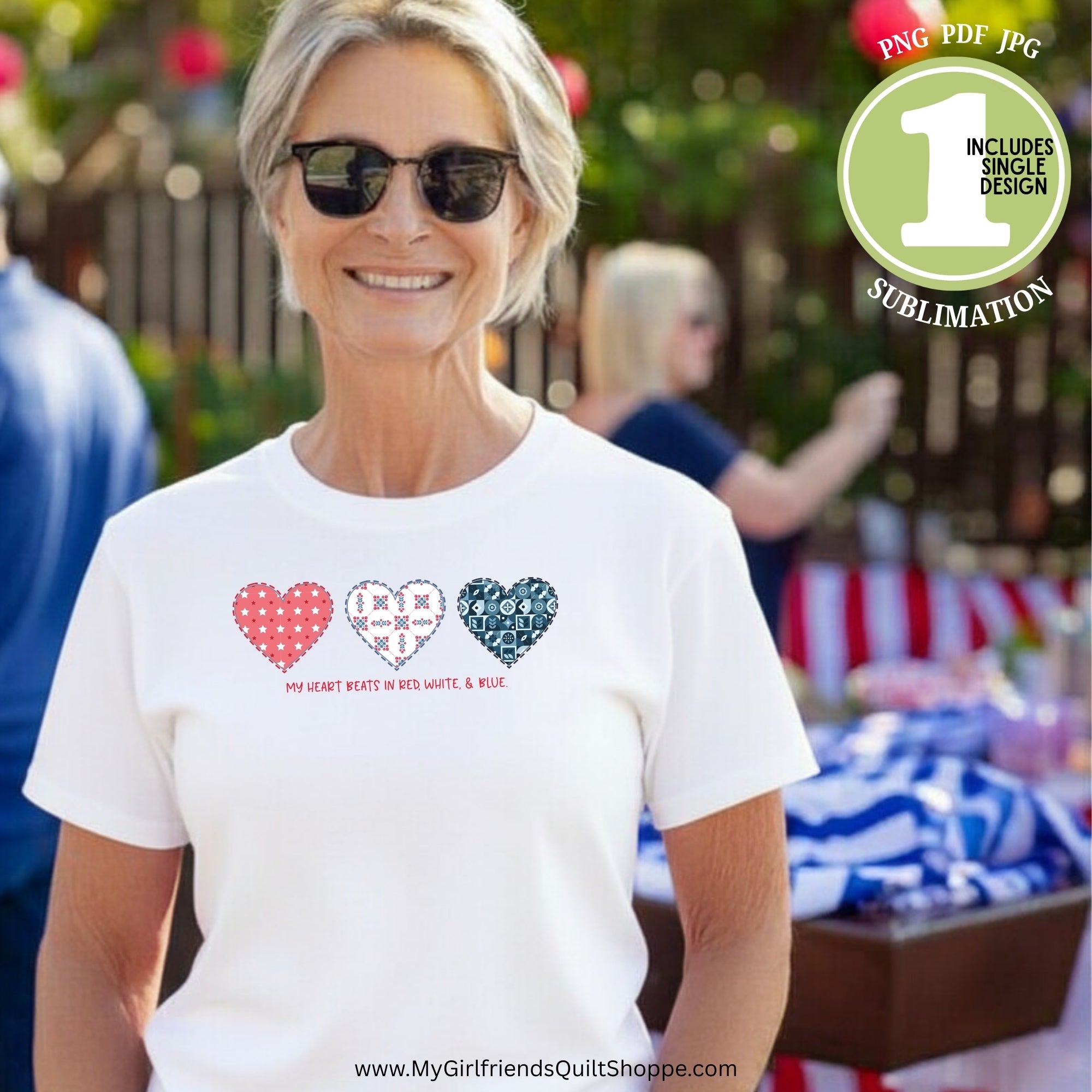 Wear your love for country with pride with this charming “My Heart Beats in Red, White, & Blue” patriotic sublimation design! Featuring three heart motifs filled with classic red, white, and blue patterns inspired by fabric, stitching, and craft textures, this design is perfect for patriotic makers, quilters, sewists, and anyone who loves celebrating America in handmade style.