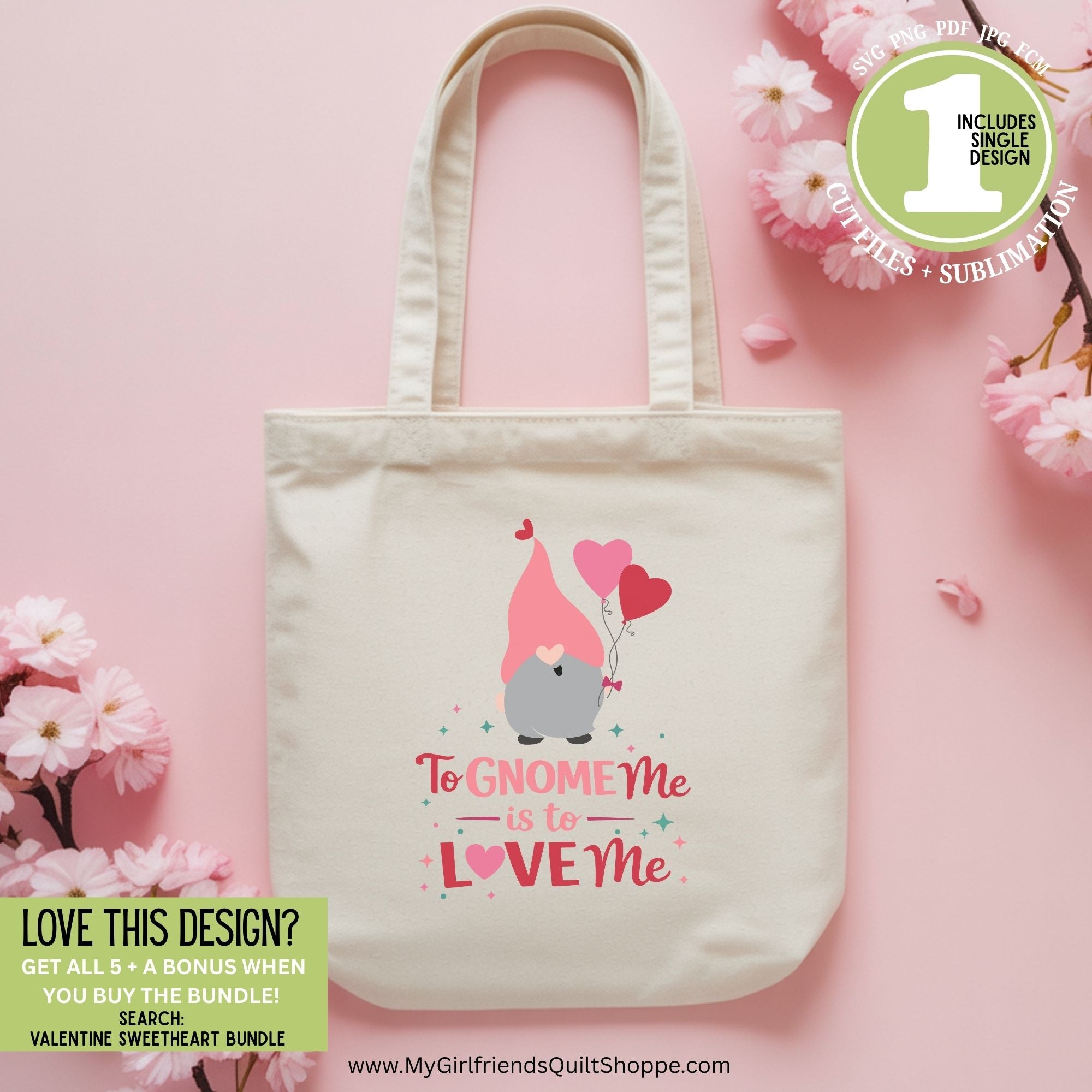 This “To Gnome Me Is to Love Me” Valentine design features an adorable gnome theme that’s perfect for Valentine shirts, gifts, décor, and cozy handmade projects.