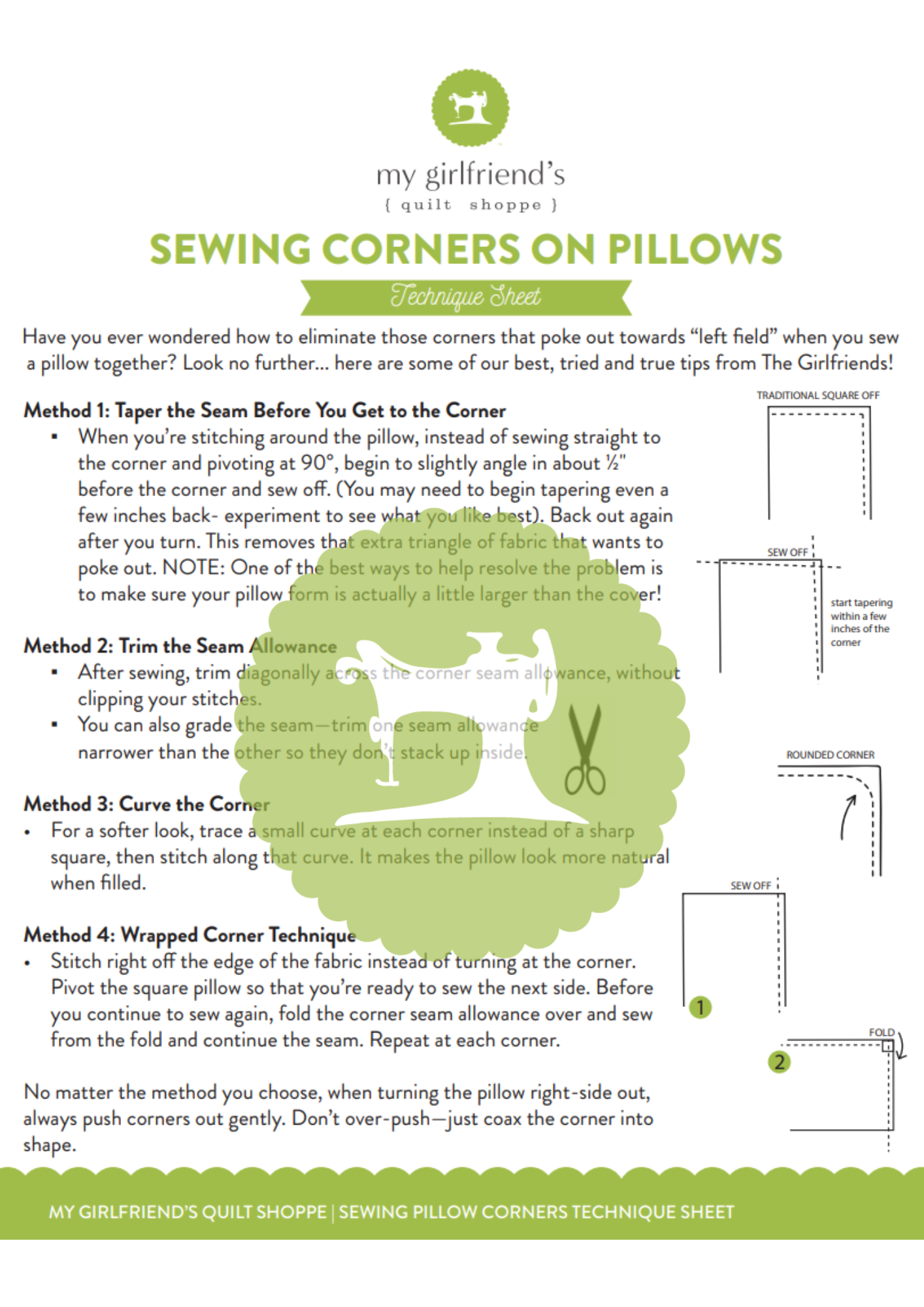 Master the art of crisp, professional pillow corners with the Sewing Perfect Pillow Corners Technique Sheet from My Girlfriend’s Quilt Shoppe! This easy-to-follow guide teaches you how to achieve clean, sharp corners that elevate your handmade pillows from homemade to high-end. Perfect for beginners and experienced sewists alike, this quick printable makes every pillow project look polished and picture-perfect.