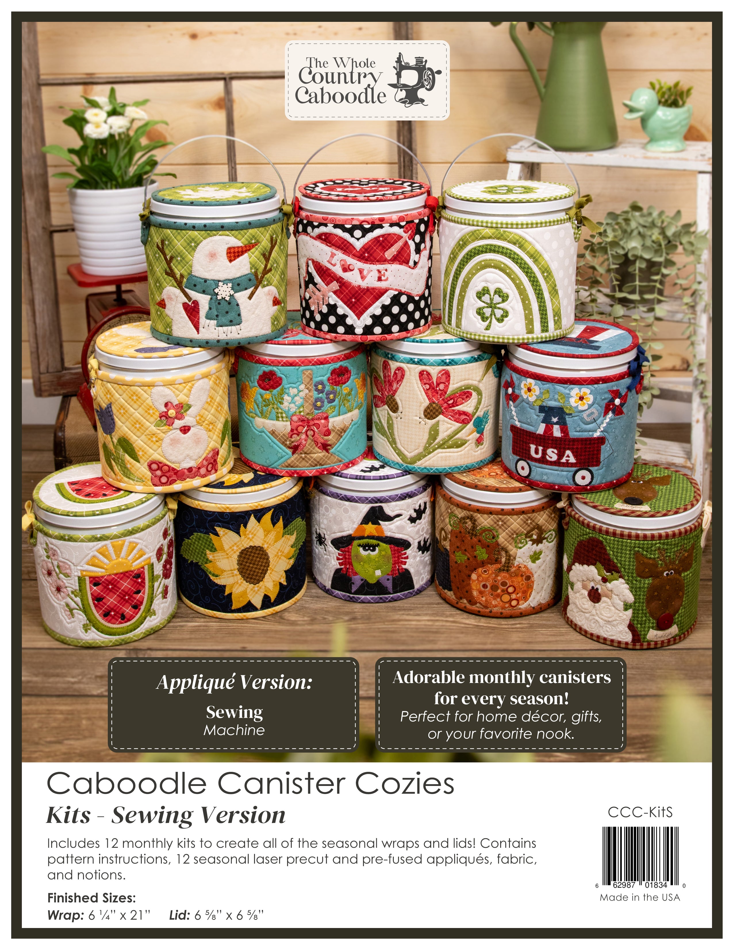 The Caboodle Canister Cozies Complete Kit includes everything needed to create all 12 seasonal wraps and lids in one convenient package, designed for embroidery machine users.