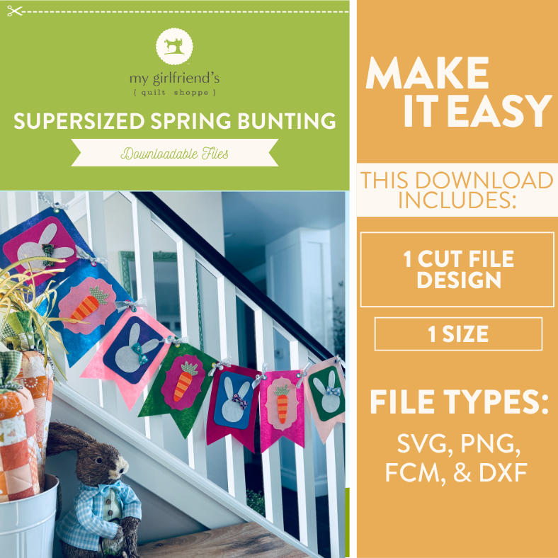 Make a bold and cheerful statement with Supersized Spring Bunting, a fun downloadable cut file design from My Girlfriend’s Quilt Shoppe. Designed with oversized pennants and playful spring motifs, this bunting is perfect for decorating mantels, party spaces, porches, classrooms, and seasonal displays.