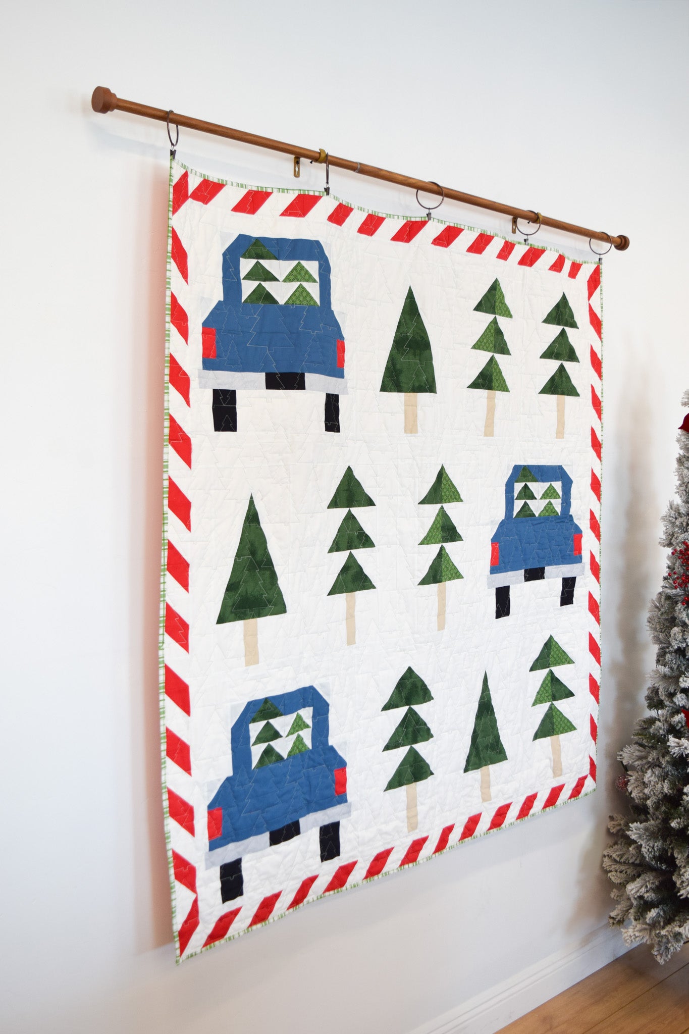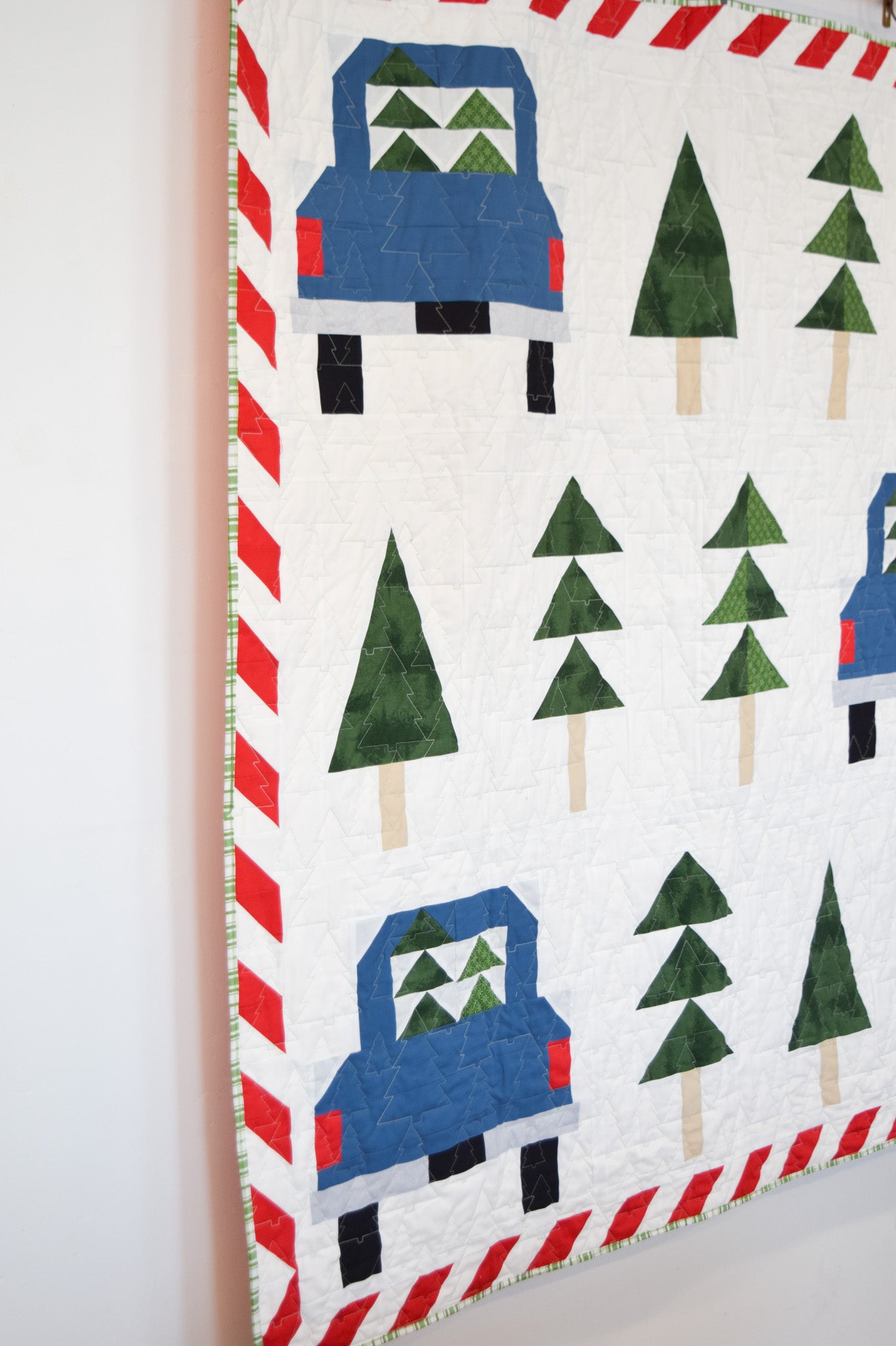 Celebrate the magic of the holidays with the North Pole Tree Farm Quilt—a cheerful and nostalgic quilt pattern featuring classic evergreen trees, vintage pickup trucks hauling Christmas trees, and a playful candy cane stripe border. This downloadable PDF sewing pattern is perfect for confident beginners and seasoned quilters alike.