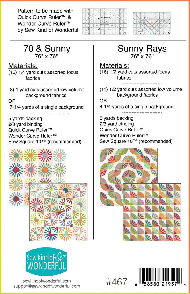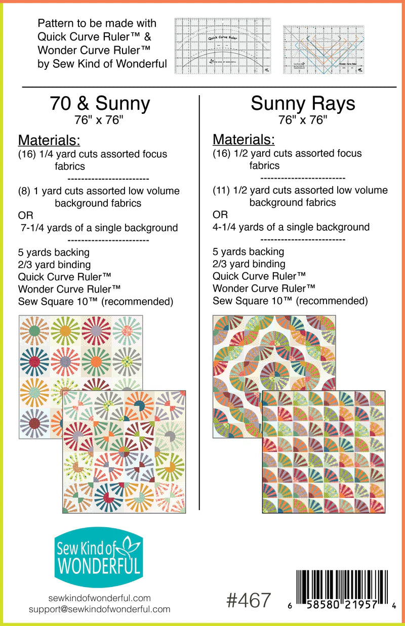 Description: Bring a little sunshine to your sewing room with the 70 & Sunny Pattern by Sew Kind of Wonderful! This cheerful quilt design features radiant curves and playful movement--just like a perfect summer day. Created with the Quick Curve Ruler, this pattern makes smooth piecing a breeze while showing off your favorite fabrics in bright modern style.