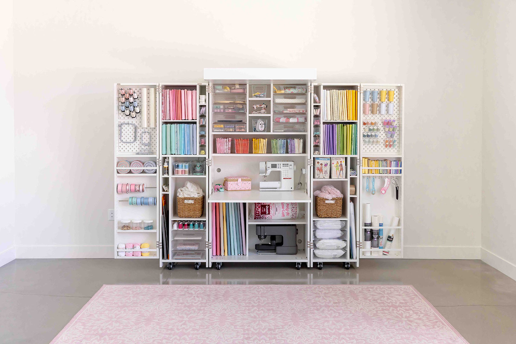 Say hello to the sewing space of your dreams with the DreamBox Shaker Sewing Bundle in White! This DIY version includes the classic DreamBox 3 with shaker-style doors, packed with smart storage and thoughtful accessories to keep your creative tools beautifully organized. Featuring a bright white workspace, built-in light crown, side table, mini bolts, totes, pegboards, and more—this all-in-one sewing hub is made for makers who love a fresh, inspiring setup.