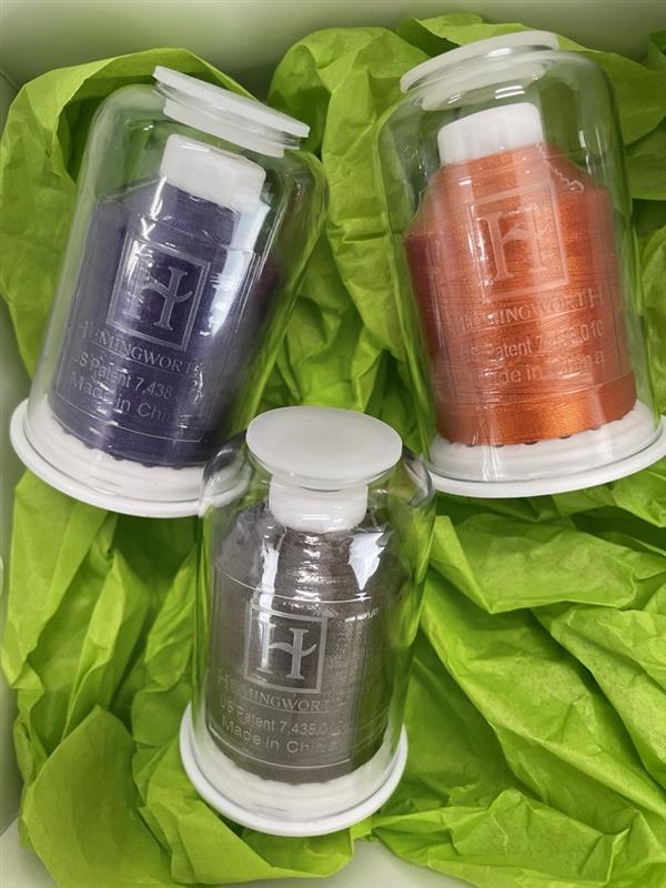 Description: Get ready to stitch up some spook-tacular magic with the Haunted Hemingworth Thread Bundle of 3! This ghostly-gorgeous trio is serving deep, moody, and mysterious vibes--perfect for quilts, embroidery, and decor that is more fang-tastic than frightening. The silky smooth, high strength Hemingworth polyester glides through your machine like a broomstick on a full moon night, while the signature cap keeps dust and tangles at bay (because cobwebs belong in your Halloween decor, not on your thread).