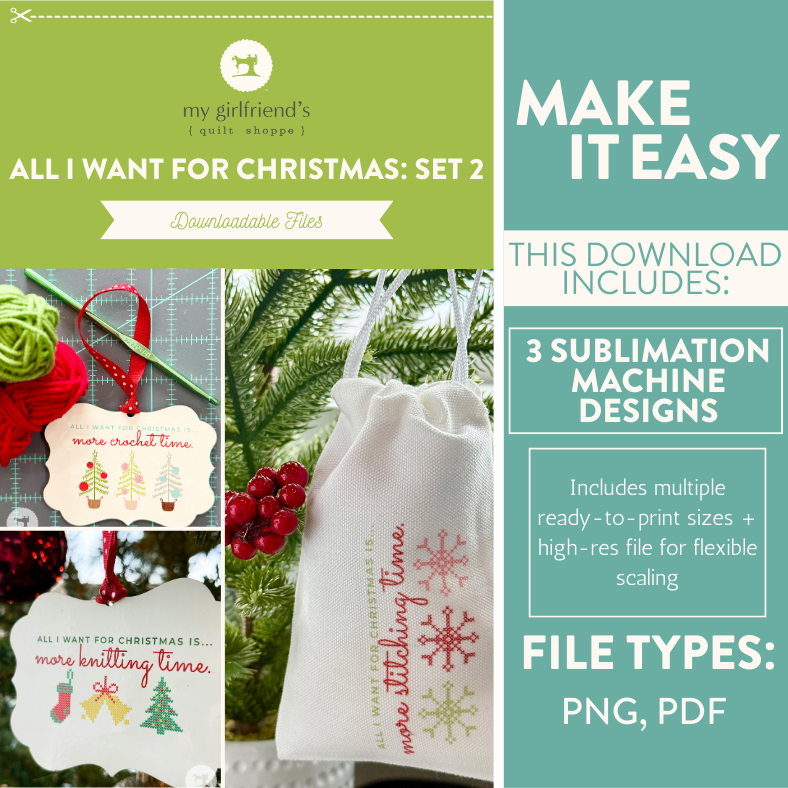 Crafty Christmas wishes, take two! This “All I Want for Christmas” set includes three coordinating sublimation designs for yarn and stitching lovers: