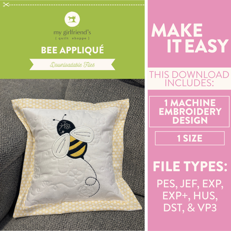 Add a touch of buzz-worthy charm to your stitching with the Bee Appliqué, an exclusive in-the-hoop embroidery design from My Girlfriend’s Quilt Shoppe! This adorable bee design is perfect for embellishing quilts, bags, towels, or seasonal décor. Quick to stitch and full of personality, it’s a sweet project that will make your embroidery projects take flight.