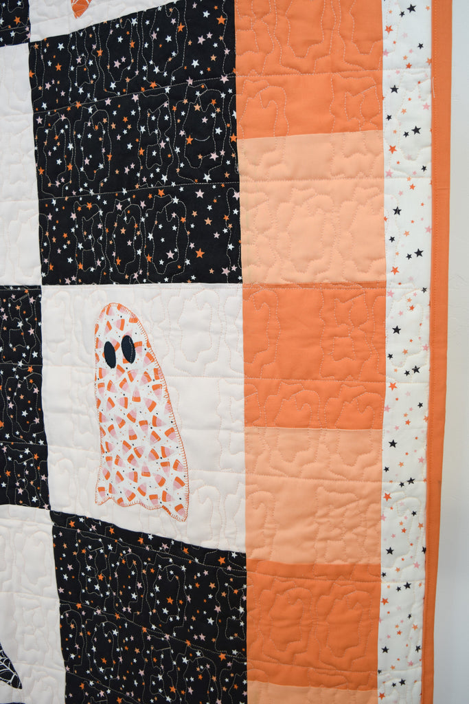 Description: Give 'em pumpkin to talk about with the Boo to You Throw Quilt Fabric Kit!  Designed by My Girlfriend's Quilt Shoppe, this spoo-tacular throw is bursting with Halloween charm--from playful ghosts to frightfully fun prints.  Whether you are snuggling up for a scary movie marathon or adding a dash of haunted happiness to your fall decor, this quilt is the ultimate treat (no tricks here!)