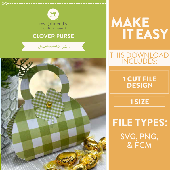 Create a charming little accessory with the Clover Purse, a delightful downloadable cut file design from My Girlfriend’s Quilt Shoppe. Shaped like a lucky clover, this adorable purse is perfect for holding small treats, coins, party favors, or festive surprises.