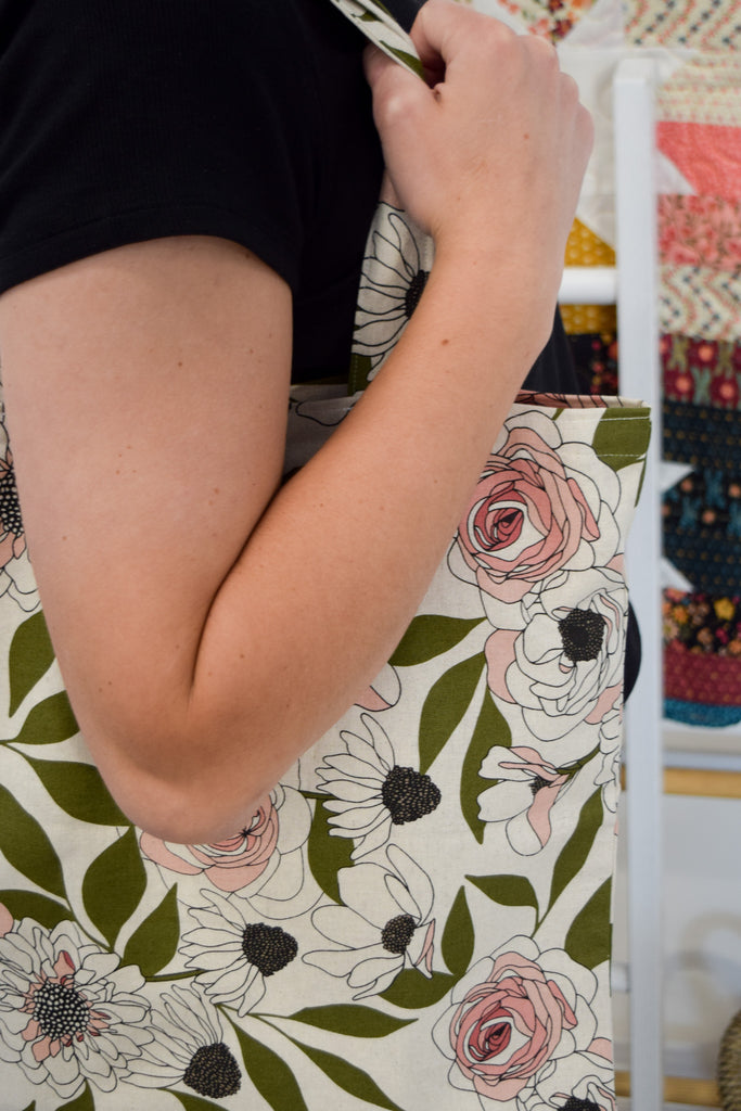 Description: Fast. Floral. Fabulous. Meet your new favorite grab-and-go project: the Always in Season PDQ Bag Kit by My Girlfriend's Quilt Shoppe! PDQ stands for "Pretty Darn Quick," and this stylish bag lives up to its name. With a floral print that is equal parts classic and chic, this kit has everything you need to stitch up a sweet and functional tote in no time. Perfect for gifting, toting, or showing off your crafty side at the farmer's market.
