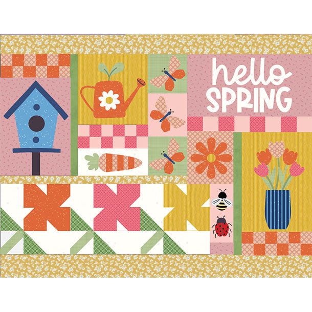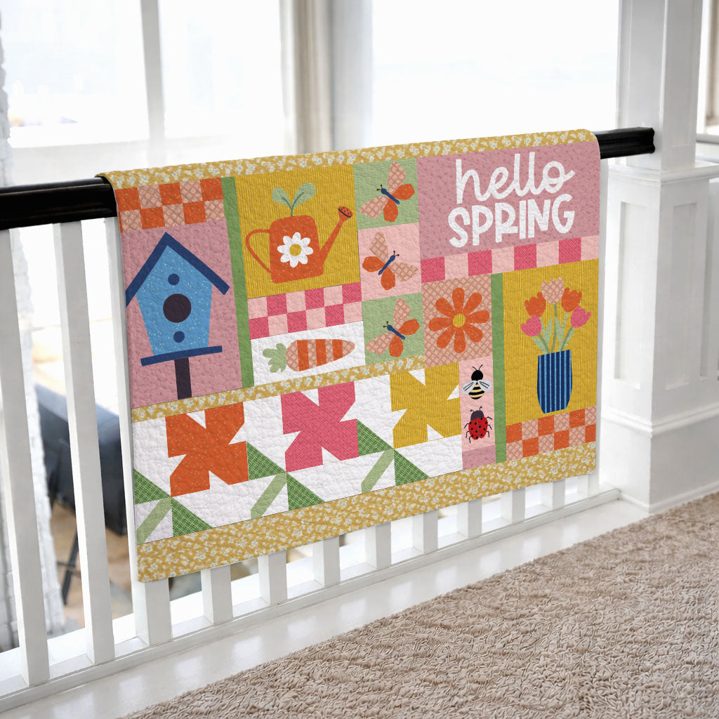Welcome spring in style with the Right Side Up Bannister and Couch Quilt: Hello Spring. Designed to be admired from every angle, this quilt features a clever right-side-up layout that looks beautiful draped over a bannister, couch, or chair—no upside-down blocks here!