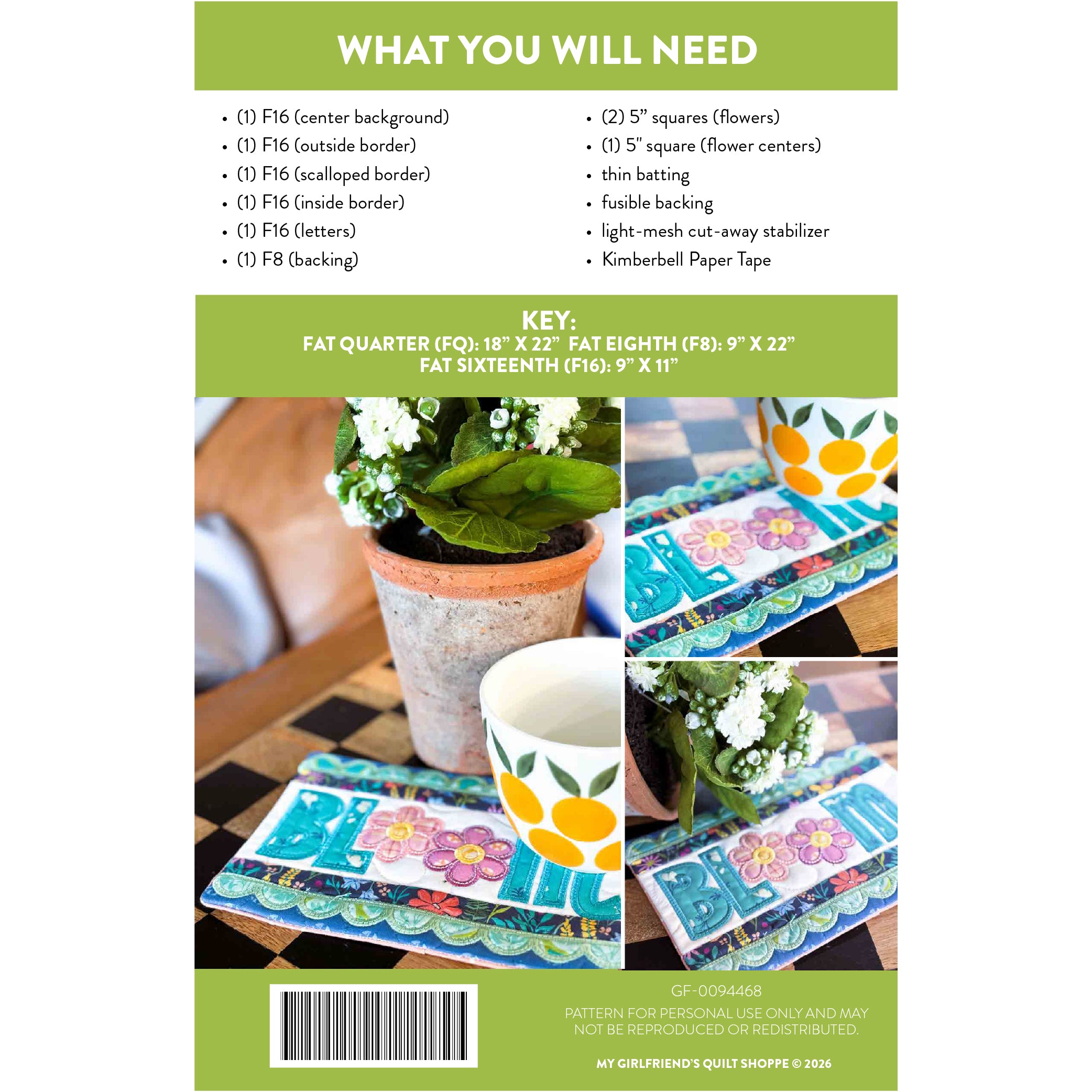 Add a cheerful floral accent to your décor with the Simply Bloom Mini Table Runner, a delightful sewing and machine embroidery pattern from My Girlfriend’s Quilt Shoppe. This eye-catching design features the word “BLOOM” with playful flower motifs replacing the O’s, framed by decorative borders and scalloped edges for a charming garden-inspired look.