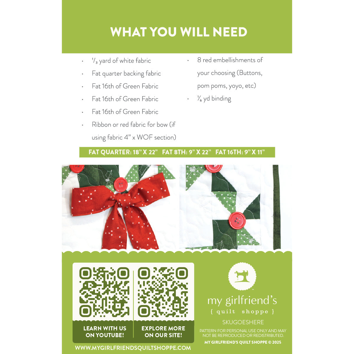 Add festive flair to your holiday décor with the Christmas Wreath Pennant Pattern, an exclusive digital design from My Girlfriend’s Quilt Shoppe! This quick and charming project features a classic wreath motif framed in a pennant shape—perfect for hanging on doors, mantels, or walls. With simple appliqué and piecing techniques, this project makes it easy to create handmade holiday cheer in just an afternoon.